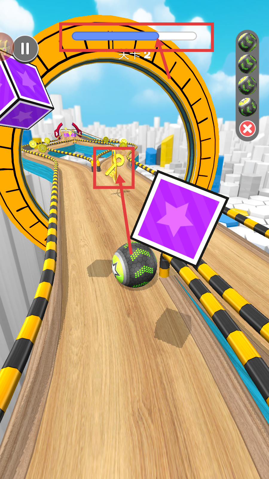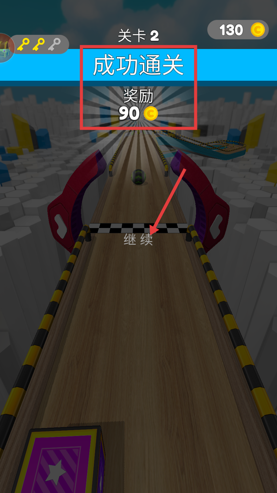 3、遇到钥匙时务必收集,这对解锁后续内容很关键,同时继续收集金币和紫色方块。