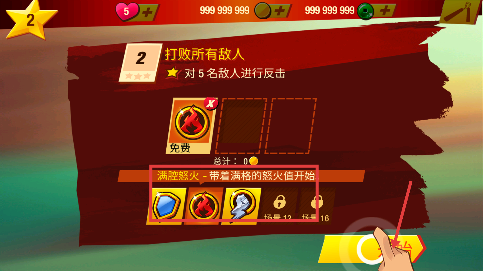 1、在关卡2选择【满腔怒火】等技能,点击开始,带着满格怒火值开启战斗,为击败敌人助力。