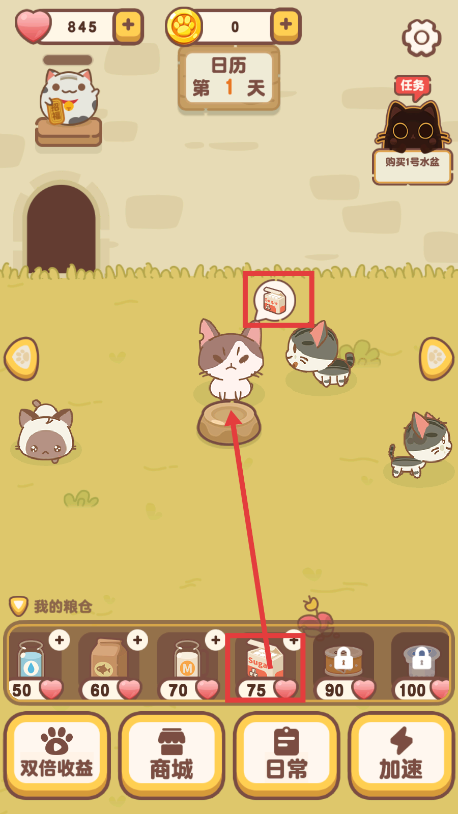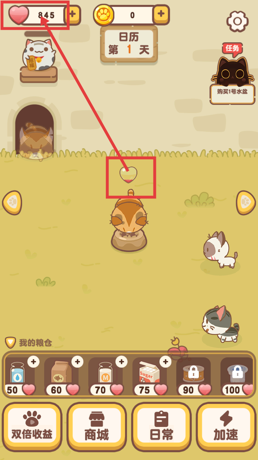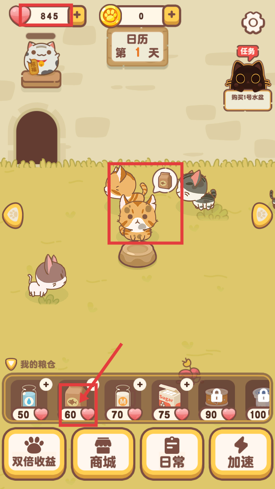 1、观察猫咪需求,投喂对应食物(如60爱心的猫粮),满足后可获得爱心反馈,积累爱心资源。