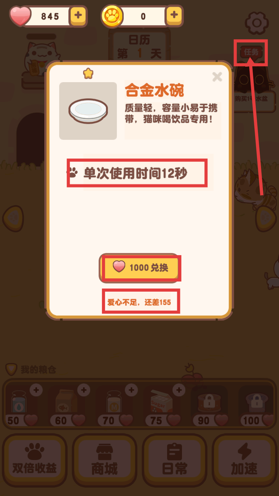 2、爱心值(如845)是核心资源,通过喂食、互动积累,用于后续物品兑换或解锁,需合理规划使用。