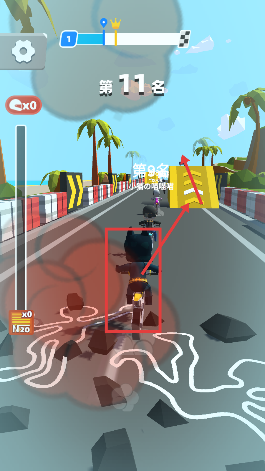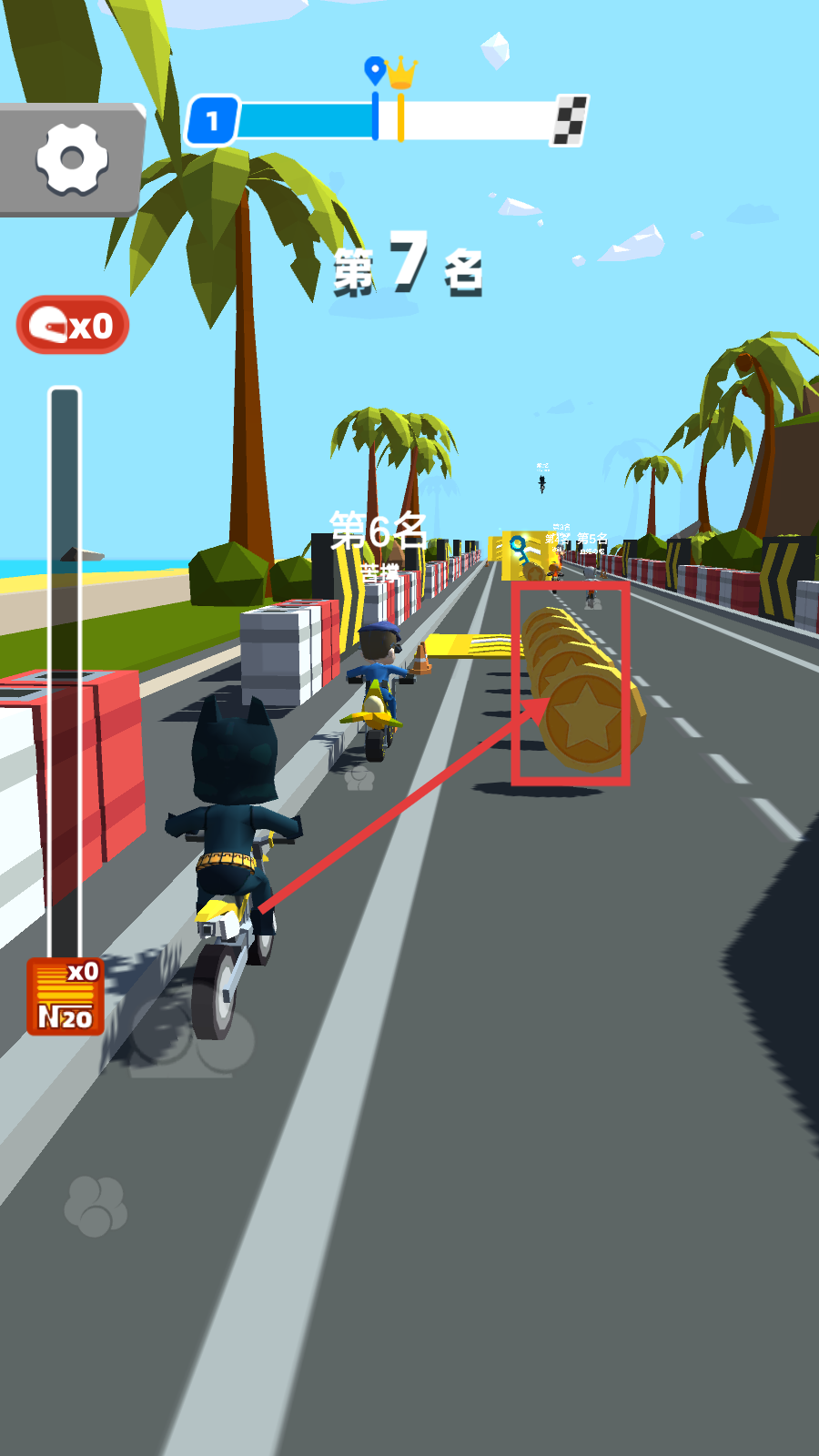 2、在赛道中操控摩托车行驶,关注排名,利用加速道具提升速度,同时避开障碍物,在夏日海滩等场景中顺利驾驶,提升竞技表现。
