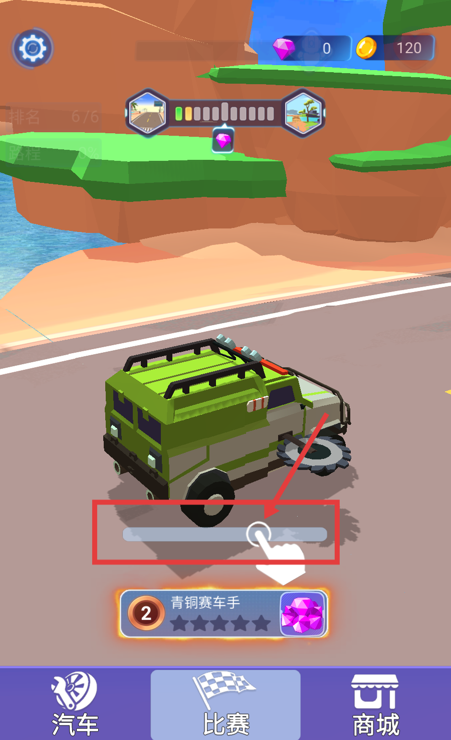 1、点击界面开始游戏,可在初始界面查看“汽车”“比赛”“商城”功能,初始为青铜赛车手等级,积累金币、钻石资源用于后续升级。