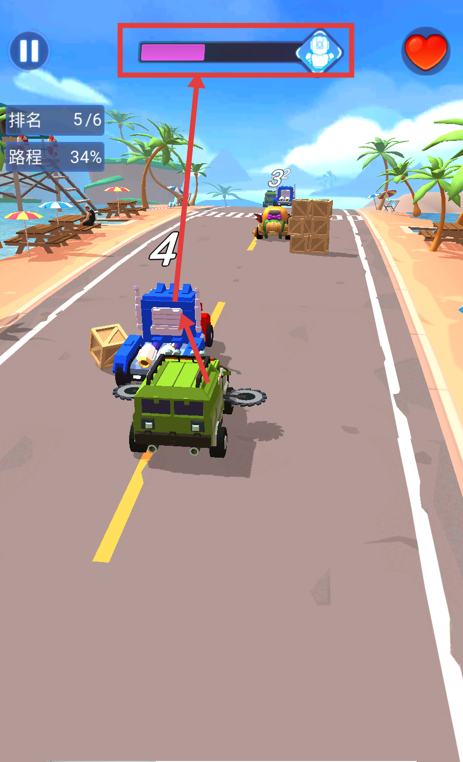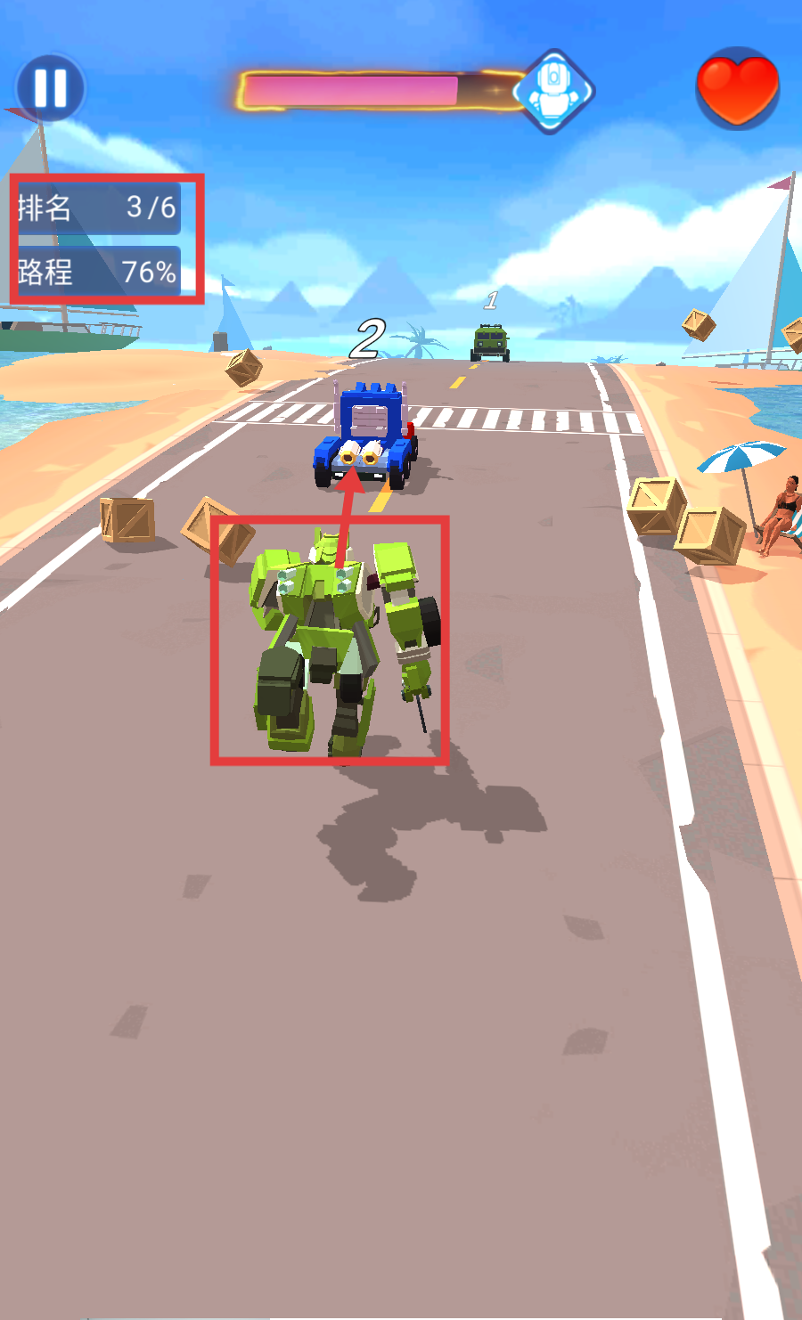 2、比赛中关注变形进度条,进度条满格后汽车可变形为机器人,变形后性能提升,助力在海滩等赛道中超车,有效提升排名。