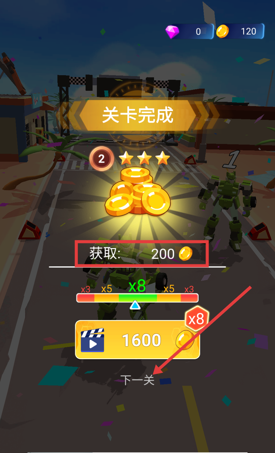 4、完成关卡后可获得金币奖励(如200金币),点击“下一关”继续挑战,积累奖励用于车辆或机器人升级,持续提升游戏体验。