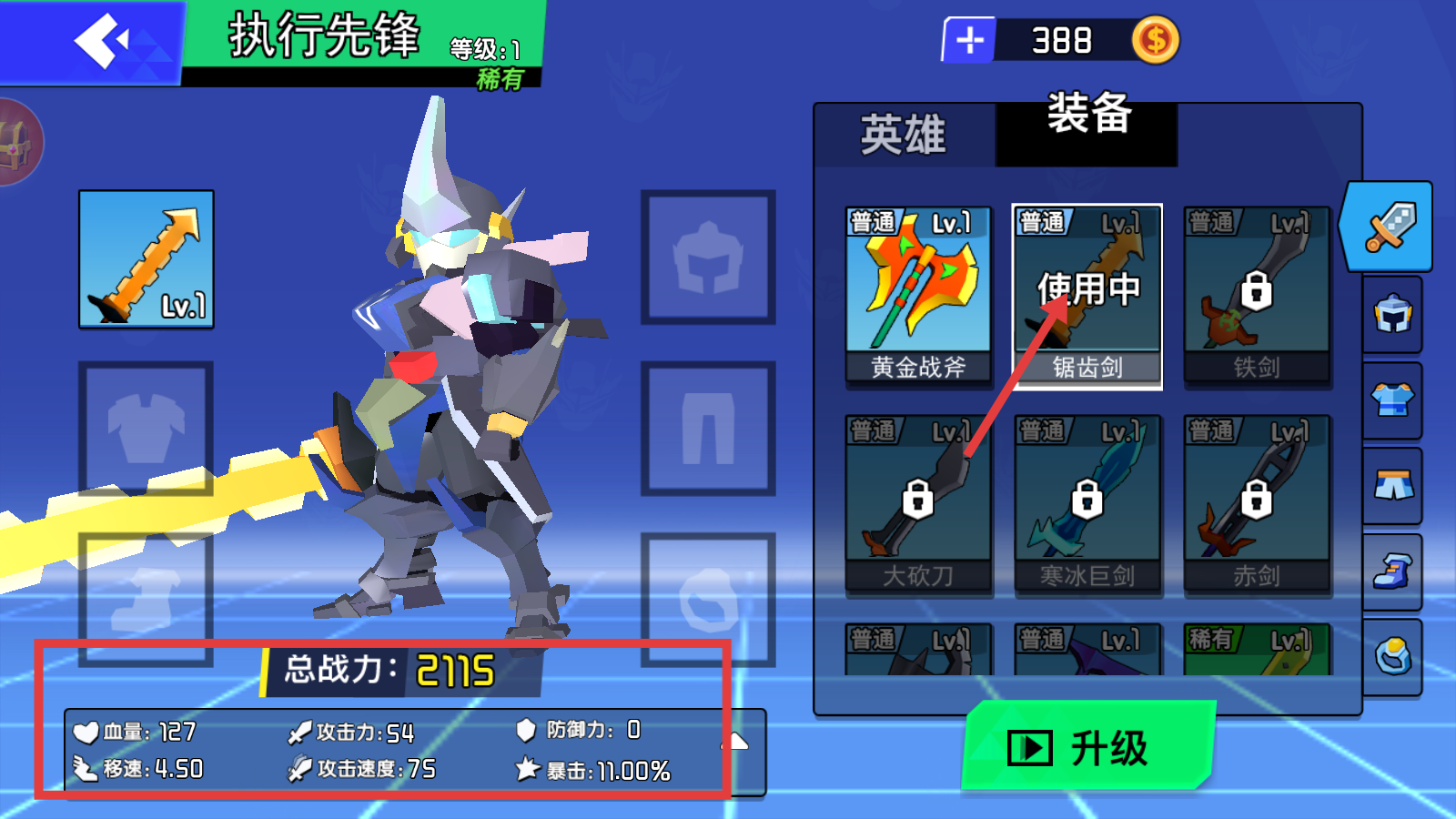 1、查看英雄【执行先锋】的装备界面,优先使用【锯齿剑】,关注总战力-2115及各项属性,升级装备可提升战力。