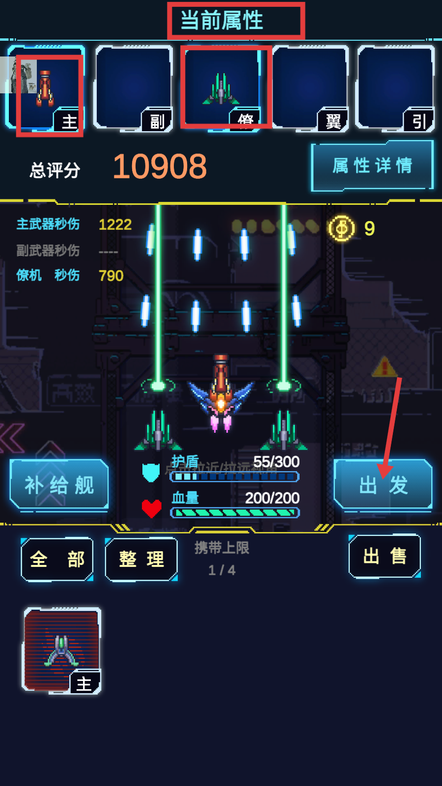 2、查看【当前属性】,搭配好【主武器】【僚机】后,点击【出发】开启新关卡挑战。