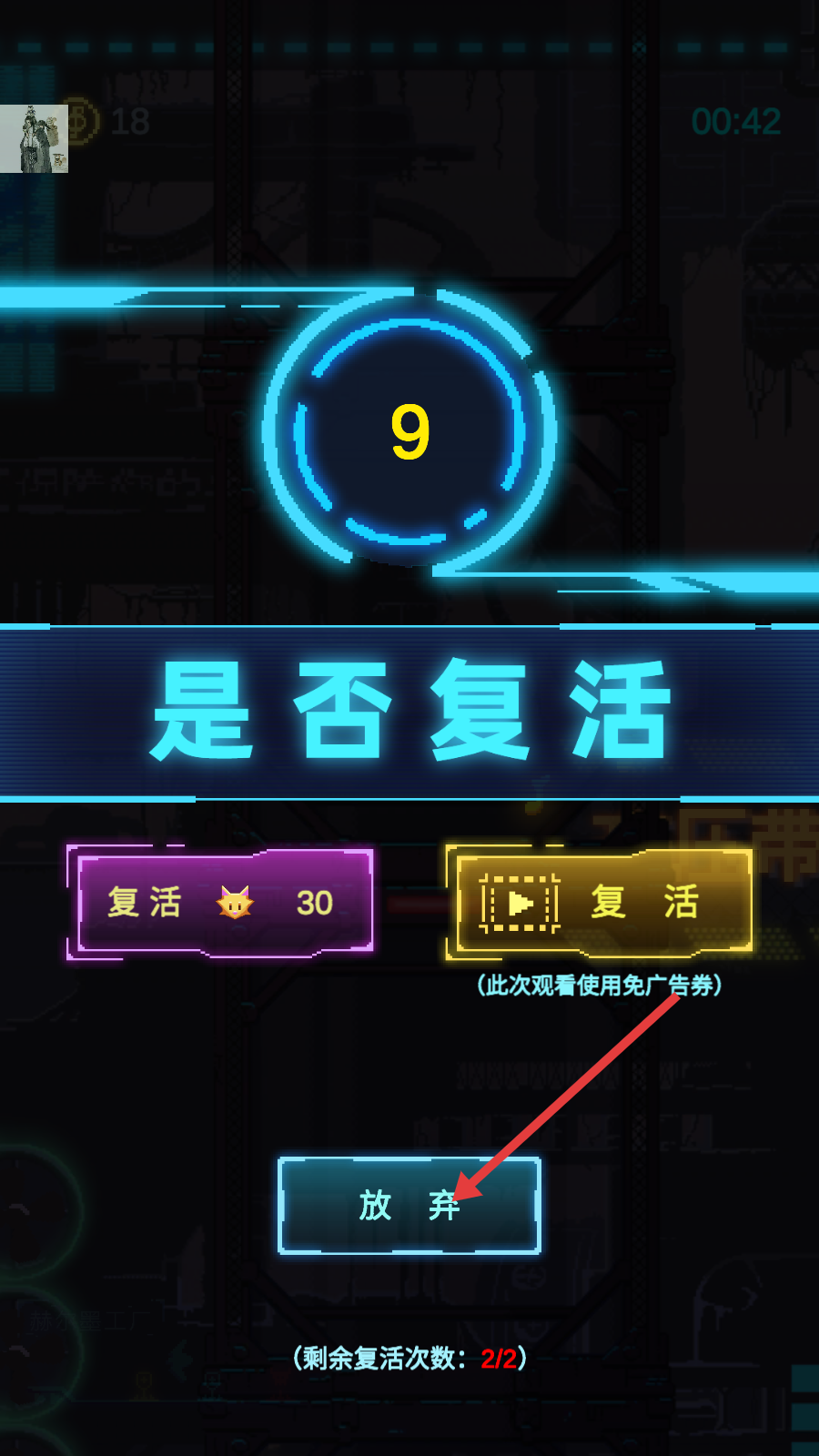 4、战机被击毁后,可选择【复活】或【放弃】,根据剩余复活次数和资源合理决策,以便继续游戏。