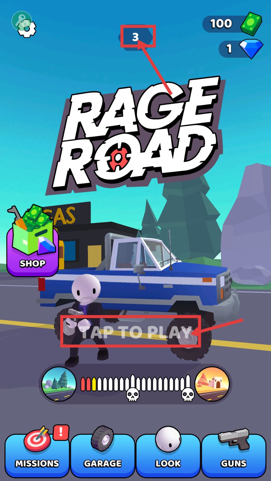 1、在【RAGE-ROAD】第3关界面,点击【TAP-TO-PLAY】开始游戏,熟悉【SHOP】等功能后开启战斗。