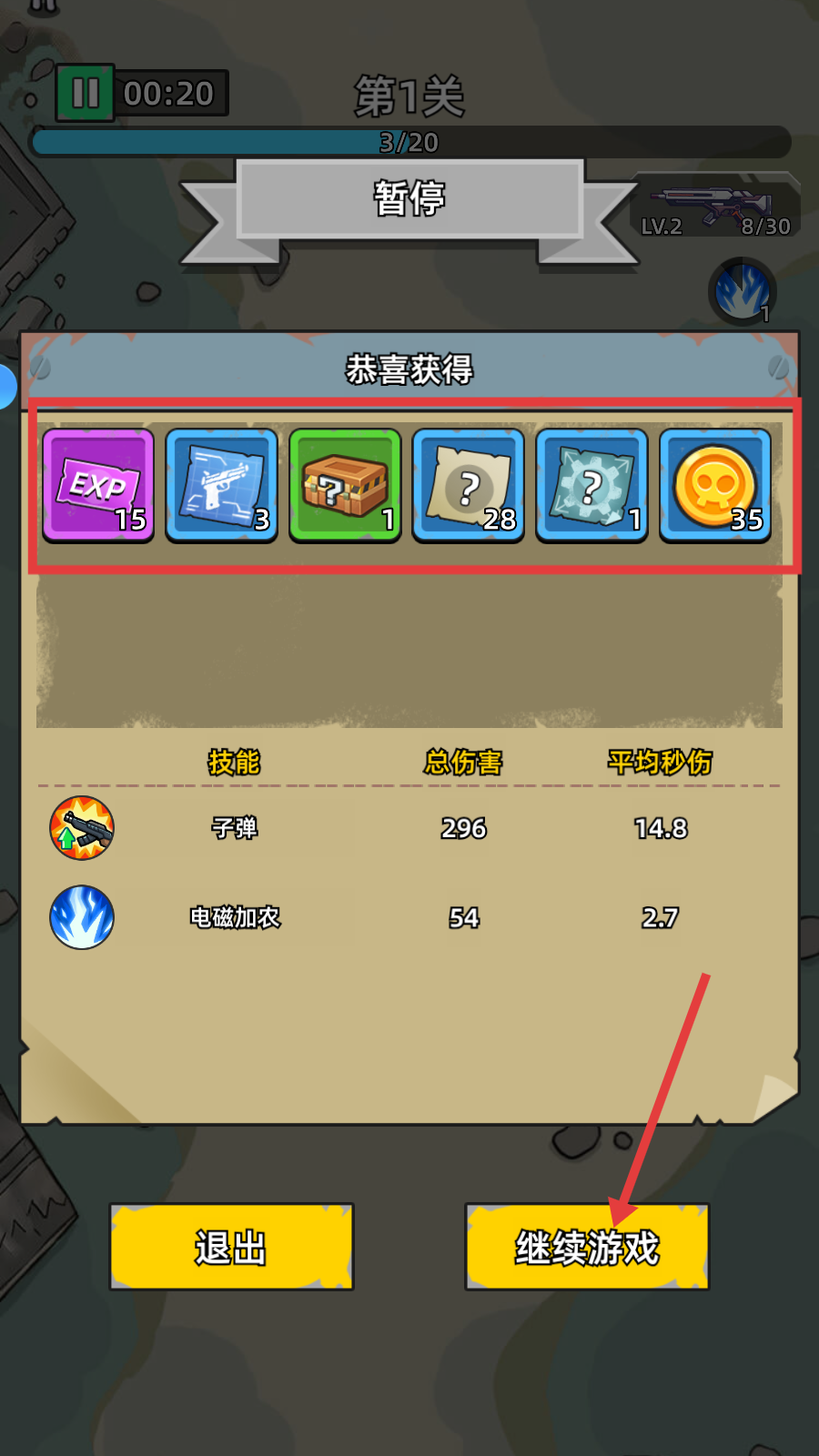 4、获得【EXP、武器、宝箱】等奖励后,点击【继续游戏】,积累资源备战后续关卡。