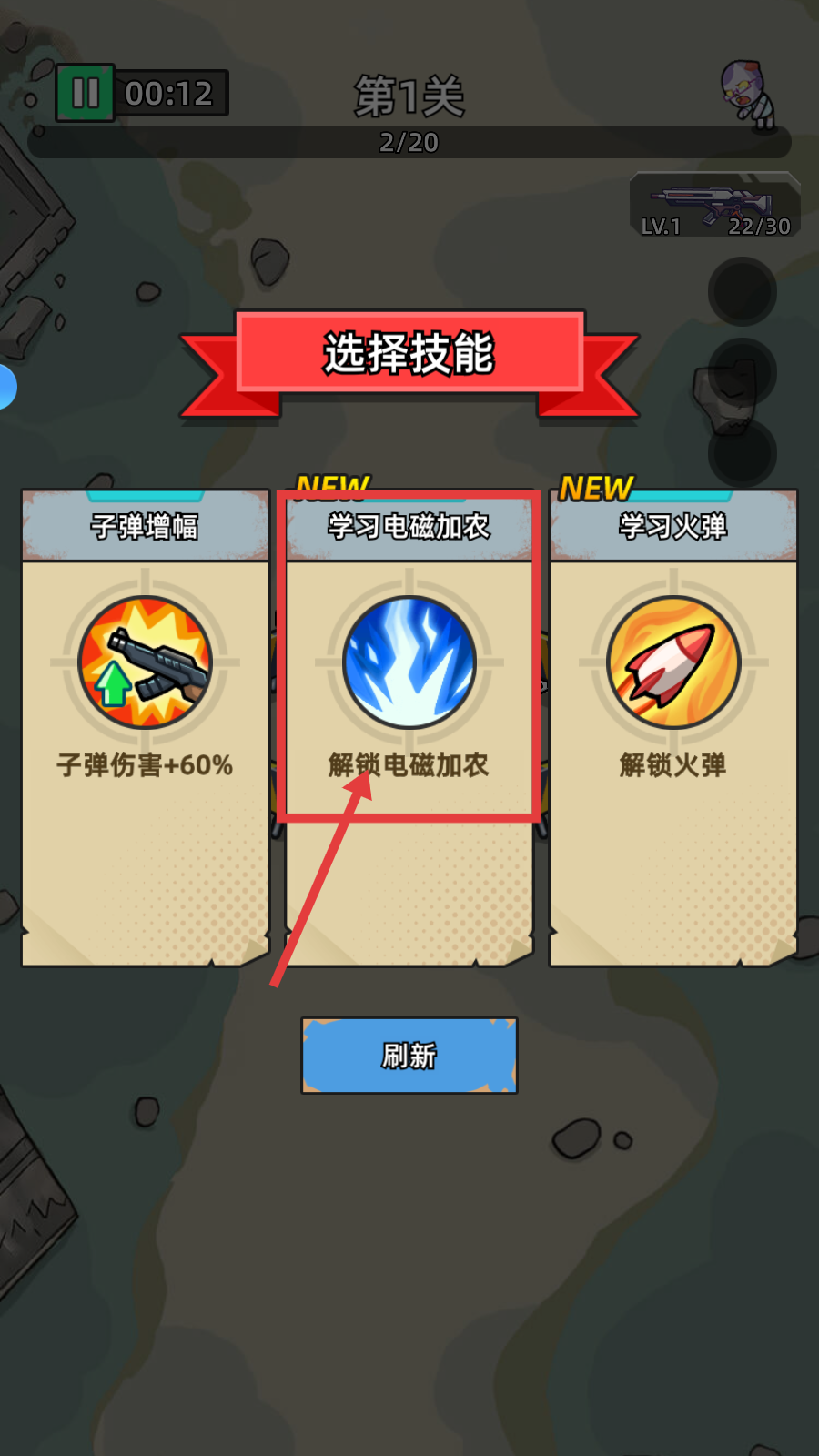 3、在技能选择界面,选择【学习电磁加农】,解锁新攻击方式,提升战力。