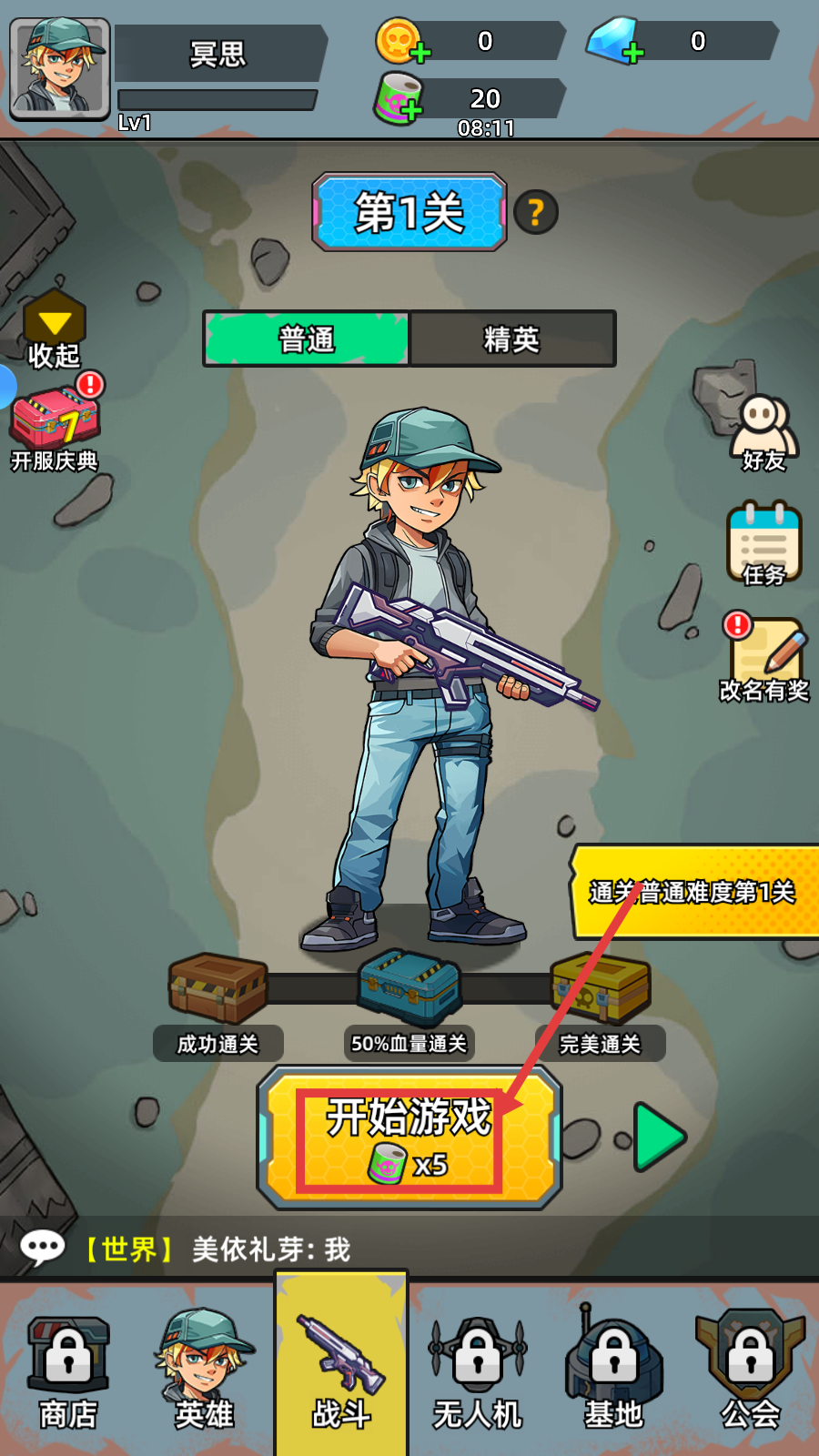 1、在第1关界面,点击【开始游戏】,开启普通难度关卡挑战,熟悉战斗流程。