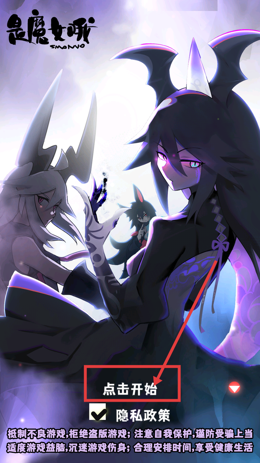 1、进入游戏前勾选【隐私政策】,点击【点击开始】,开启《是魔女哦》的魔女冒险之旅,先熟悉初始界面操作。