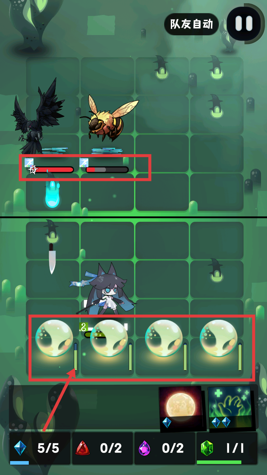 3、战斗中收集下方资源,利用【队友自动】功能让队友辅助战斗,关注资源进度【5/5-等】,确保资源收集完整。