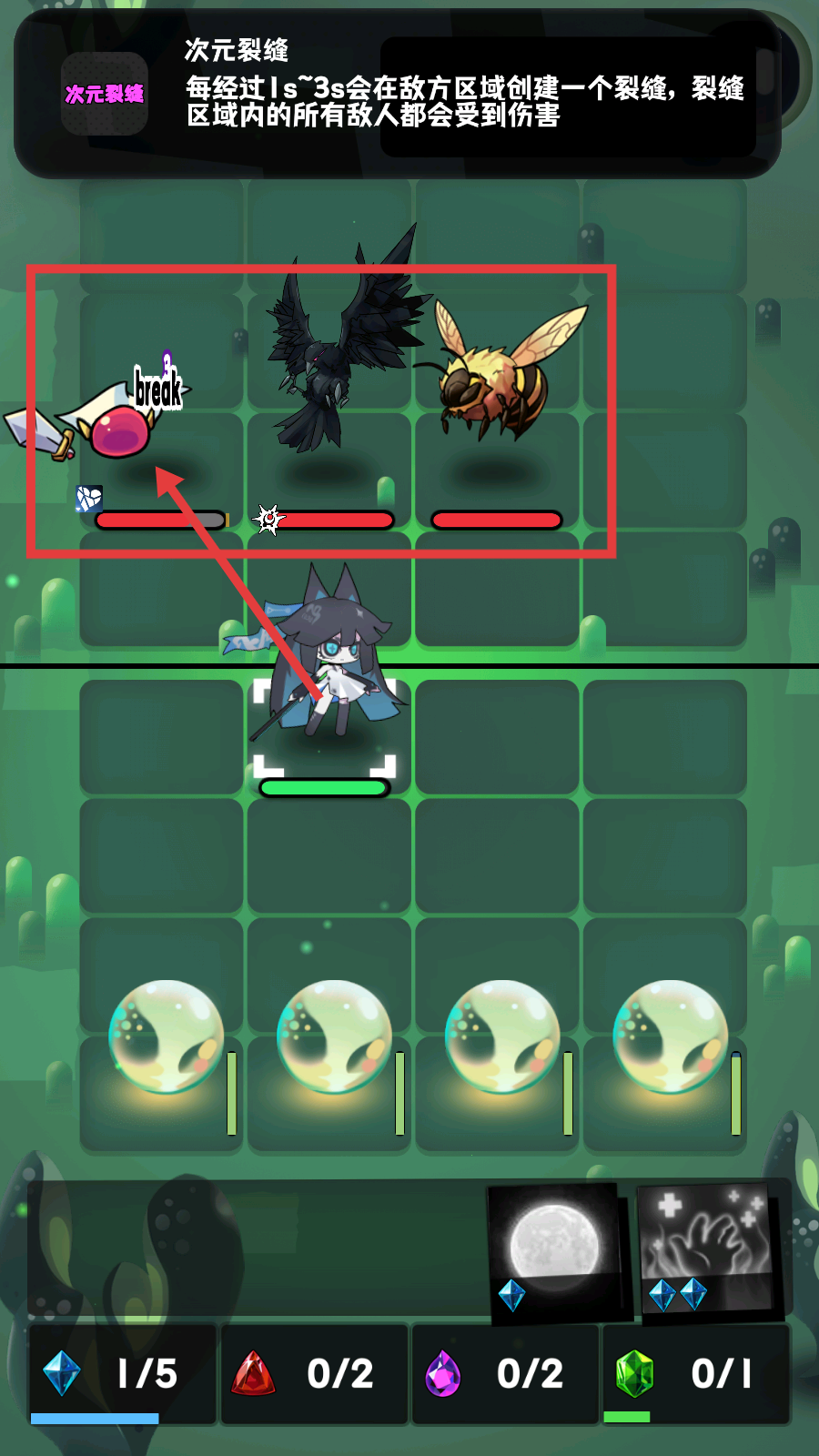 2、战斗时留意【次元裂缝】技能,每1~3秒在敌方区域创裂缝伤敌,同时攻击带【break】标识的敌人,高效清怪。