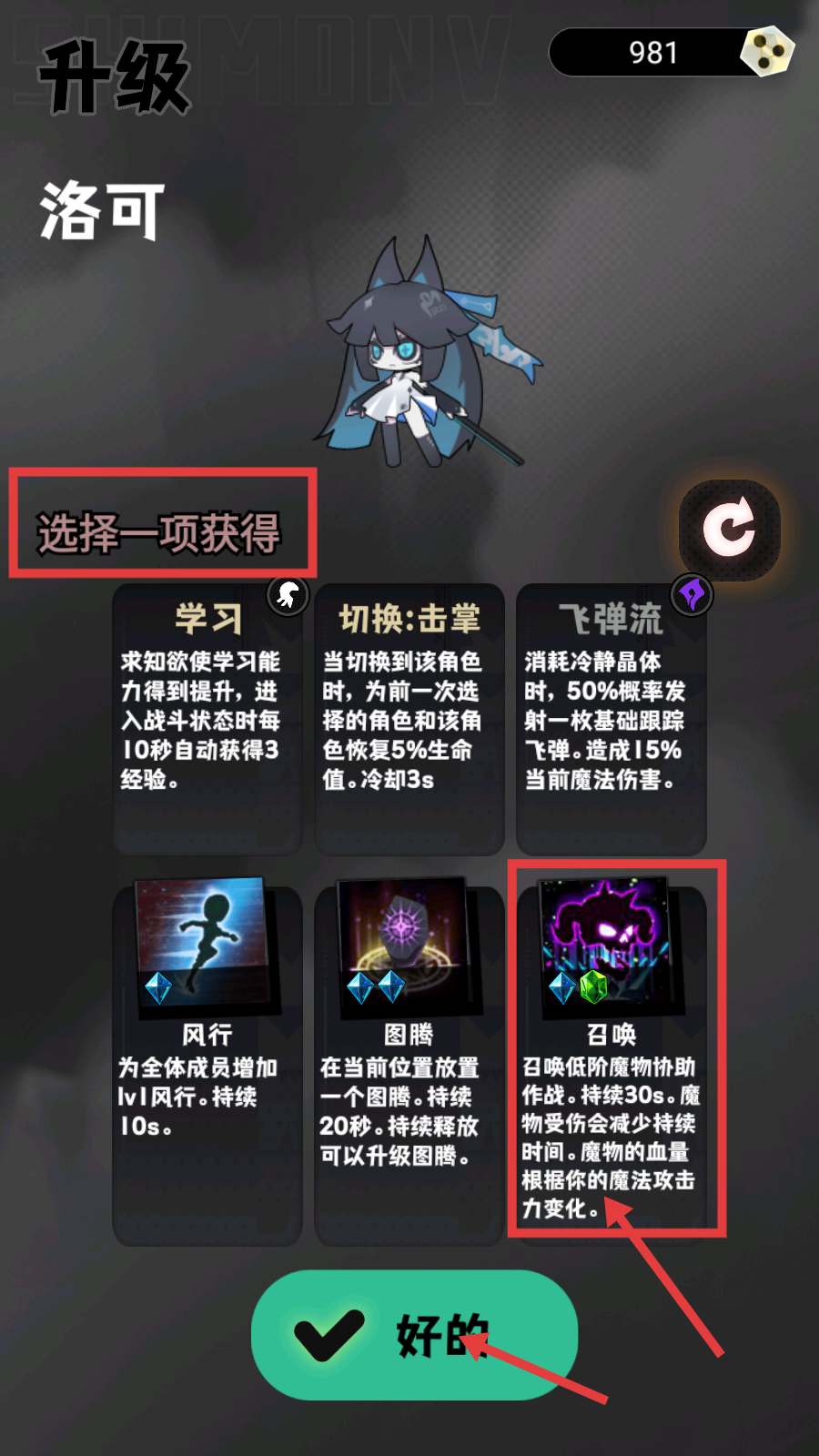 1、升级【洛可】时,在【选择一项获得】中可挑选【召唤】技能,召唤低阶魔物协助作战,选好后点击【好的】提升战力。