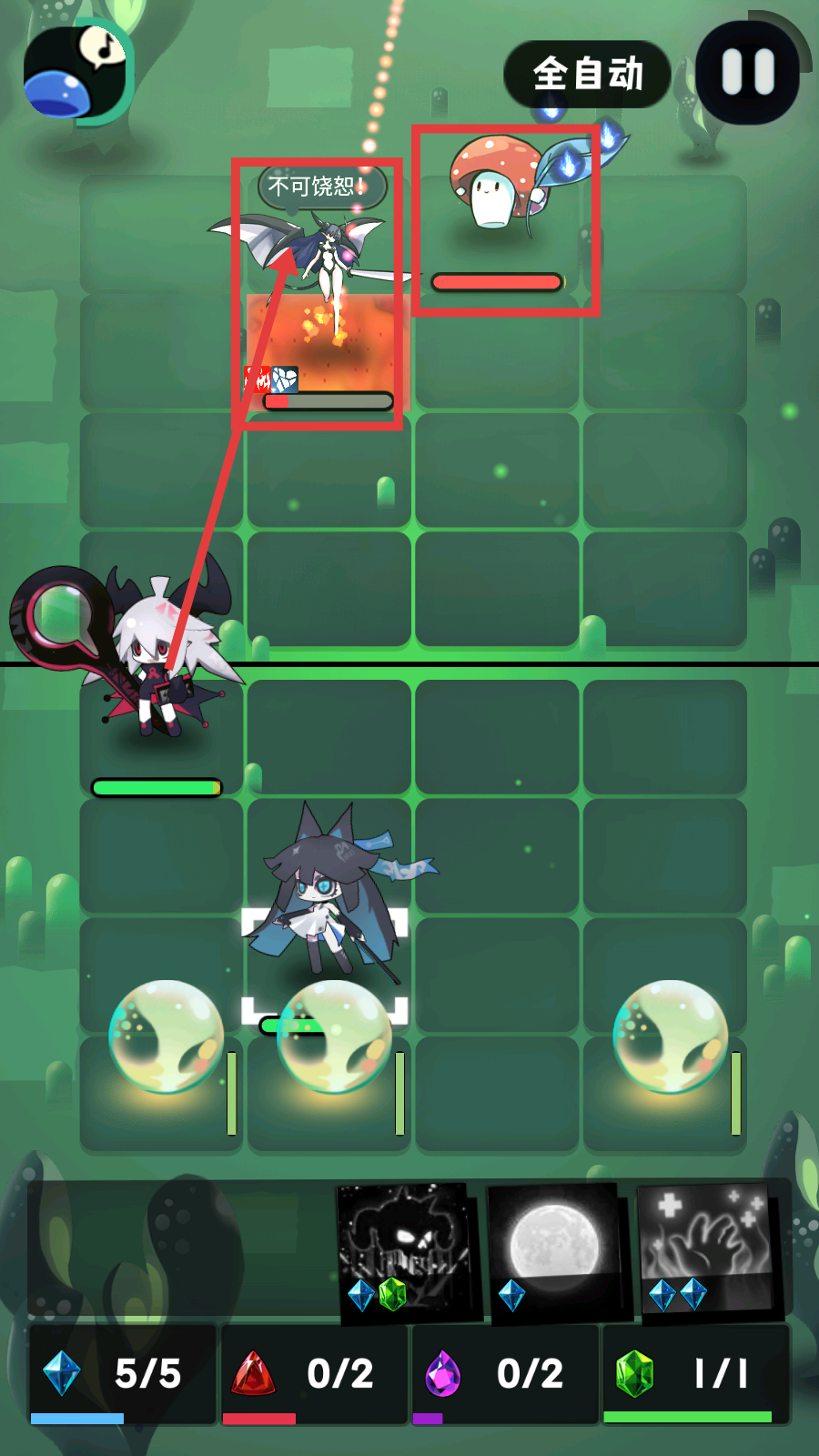 2、战斗时开启【全自动】模式,攻击带有【不可饶恕】标识的敌人与蘑菇怪,关注敌人血条,高效清怪推进战斗。