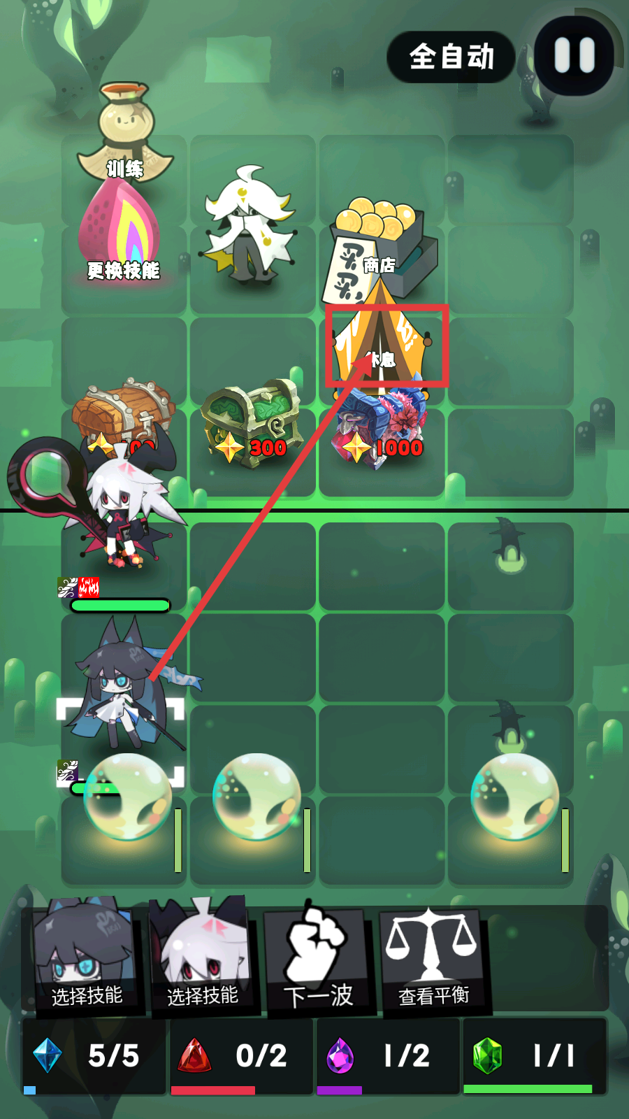 4、基础操作通过拖拽部署魔女角色,自动战斗过程中收集资源,逐步强化队伍整体实力。