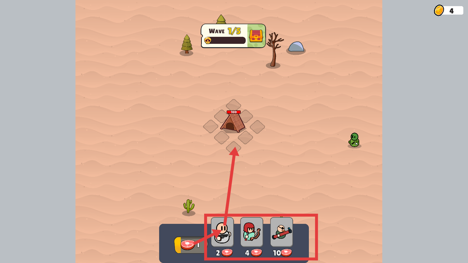 2、战斗前消耗肉召唤下方不同角色,将其布置在建筑周围,利用角色战力抵御敌人进攻。