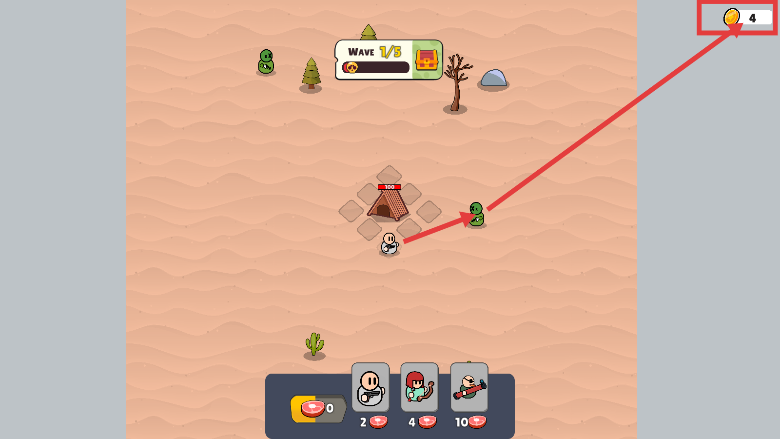 1、进入【Dusty-Desert】场景,点击【START-WAVE】开启第1/5波战斗,开启沙漠防御冒险之旅。
