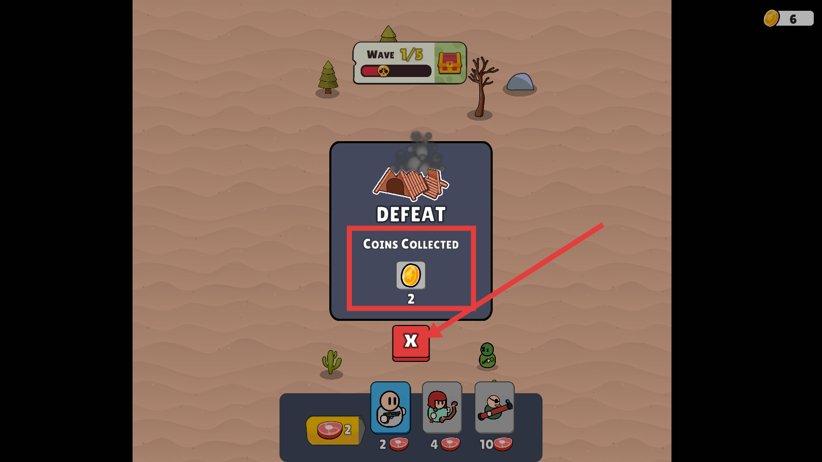 4、若战斗失败,查看【Coins-Collected-2】,点击【X】关闭失败界面,重新规划防御策略继续挑战。