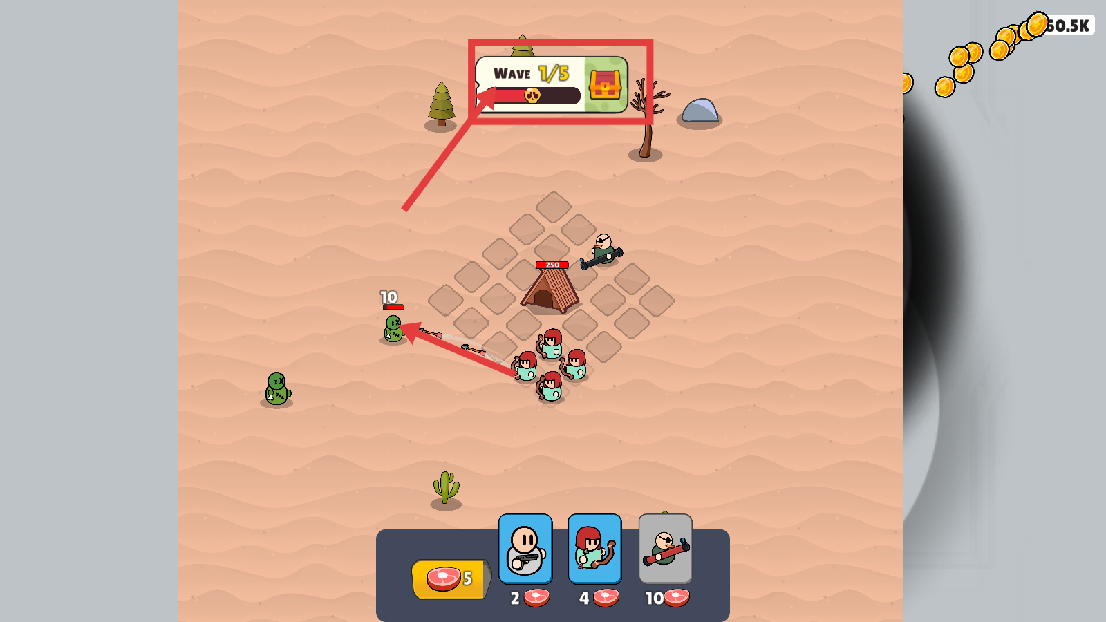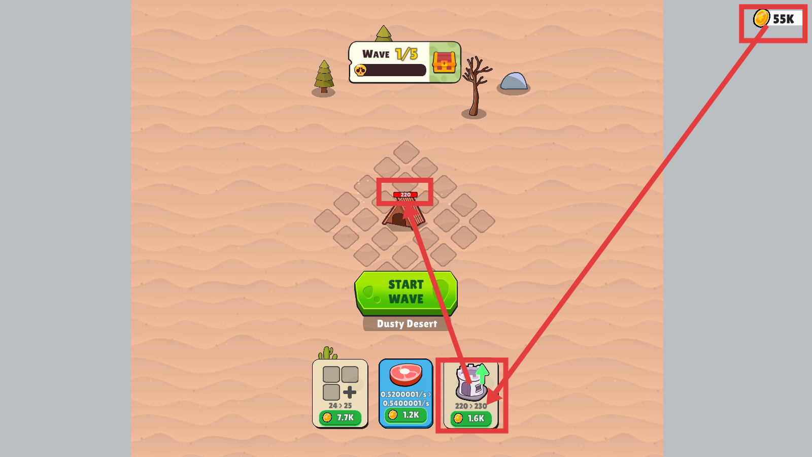 1、在【Dusty-Desert】场景,消耗【1.6K-金币】升级建筑【220>230】,积累【55K-金币】后点击【START-WAVE】开启第1/5波战斗。