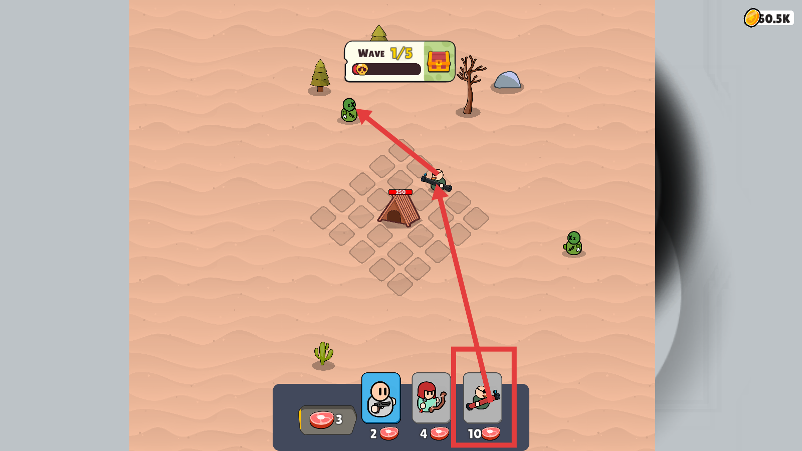 2、消耗10肉召唤强力角色,将其布置在建筑周围,攻击绿色敌人,利用高战力角色高效清怪。