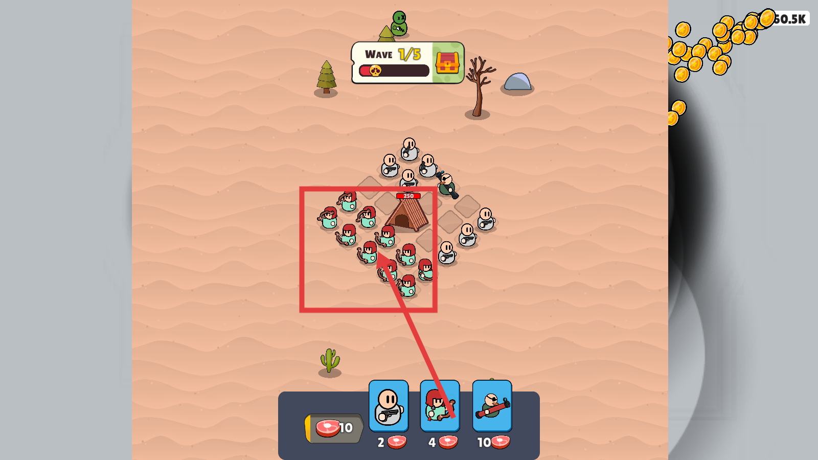4、大量召唤不同角色,围绕建筑构建密集防御阵线,抵御敌人进攻,确保顺利通过5波战斗。
