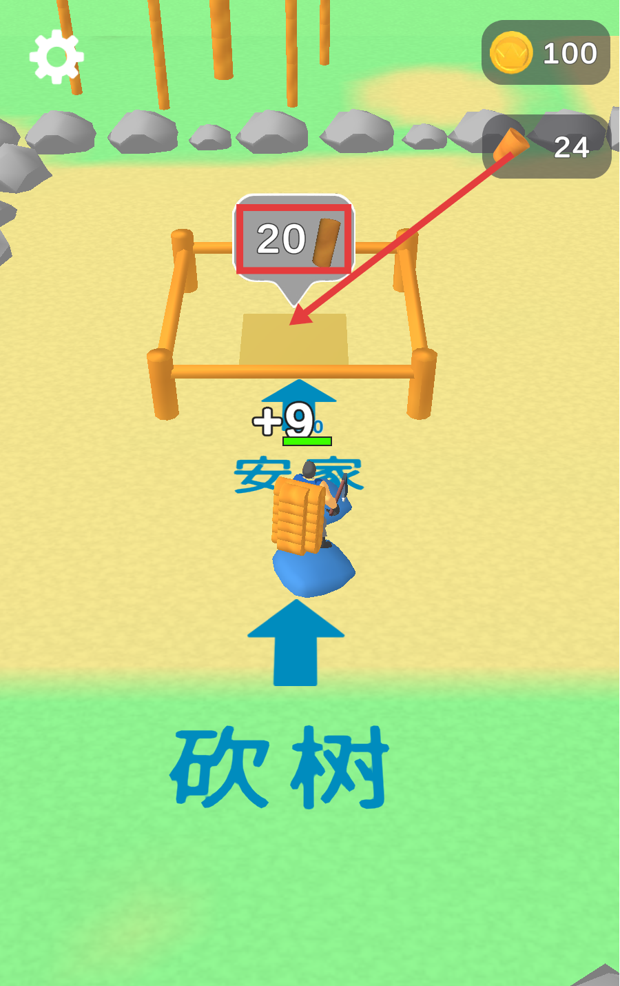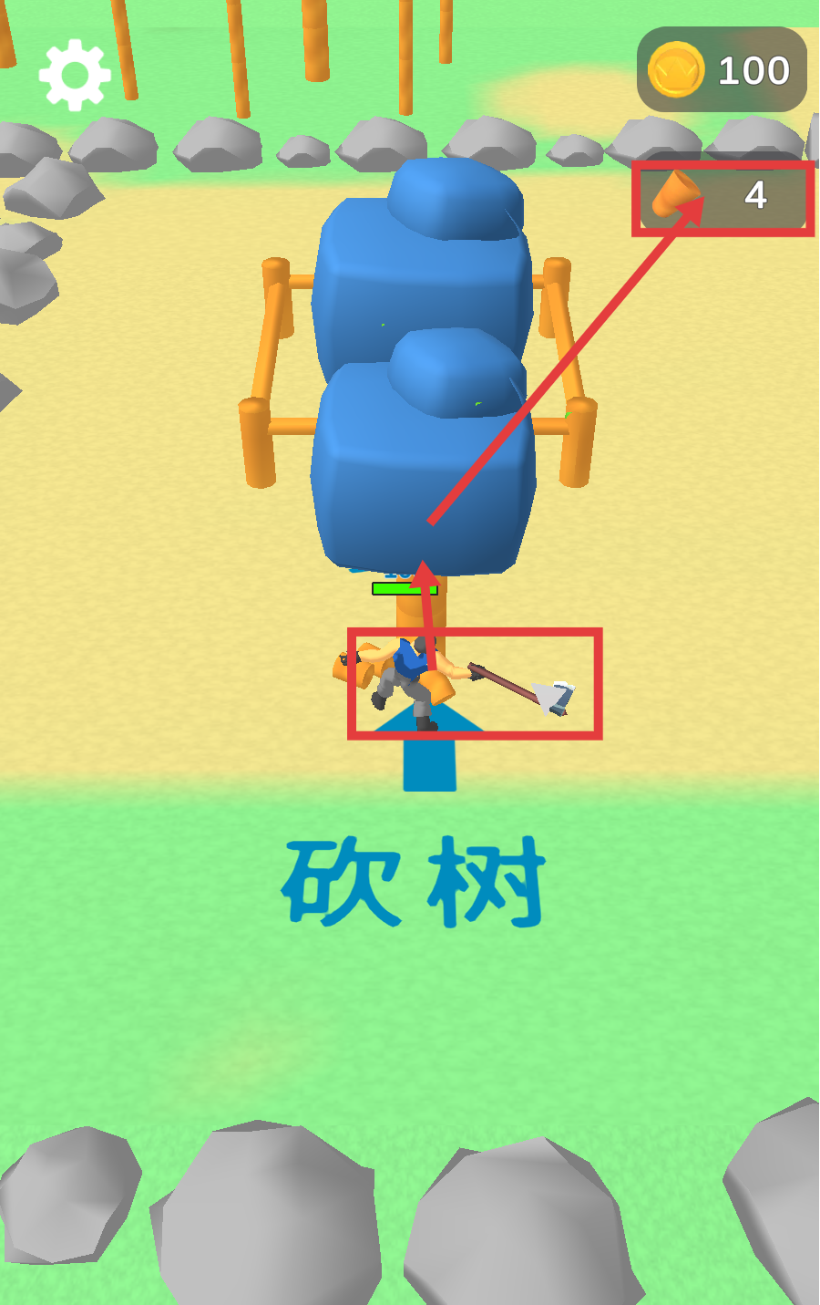 2、找到树木后,控制角色砍树,可获取【木材-资源】,右上角会显示当前木材数量,持续收集为后续建筑做准备。