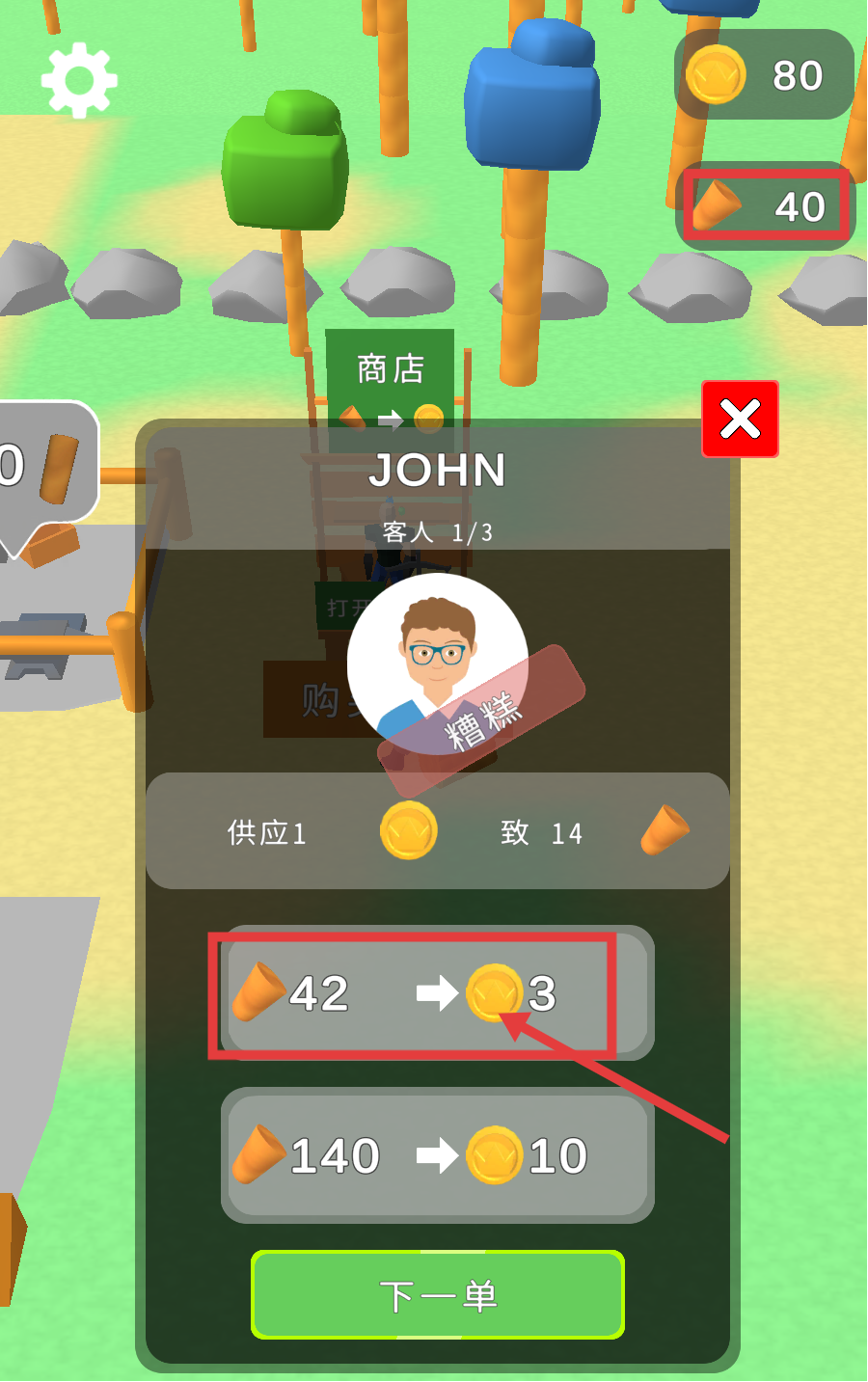 3、进入商店,可将木材兑换为金币,如【42-木材】可换【3-金币】,通过交易积累金币用于后续升级。