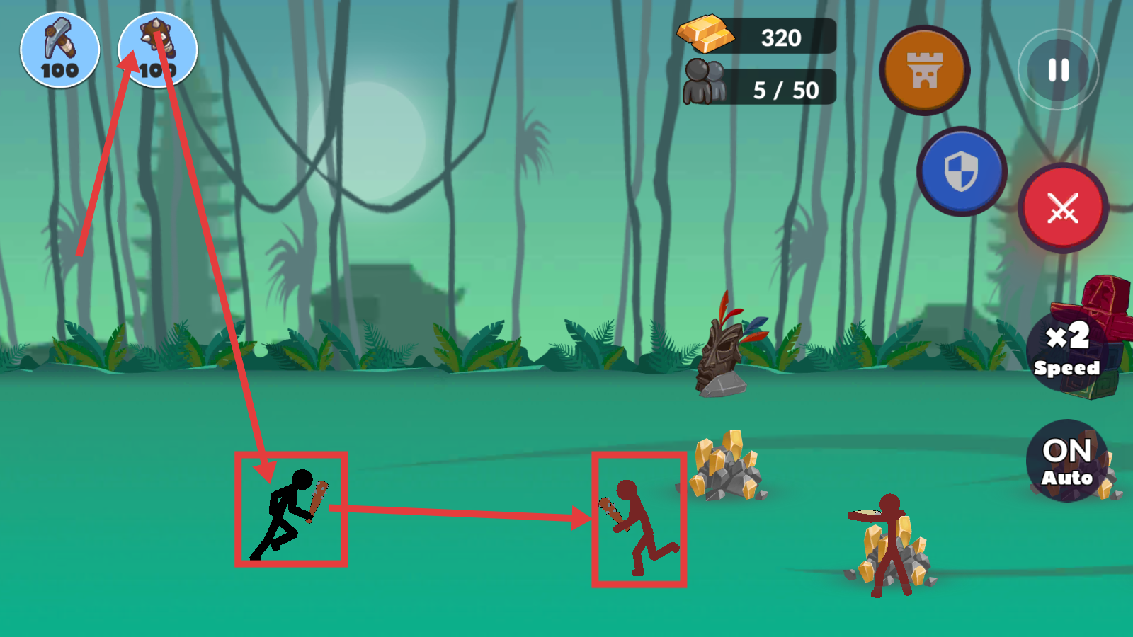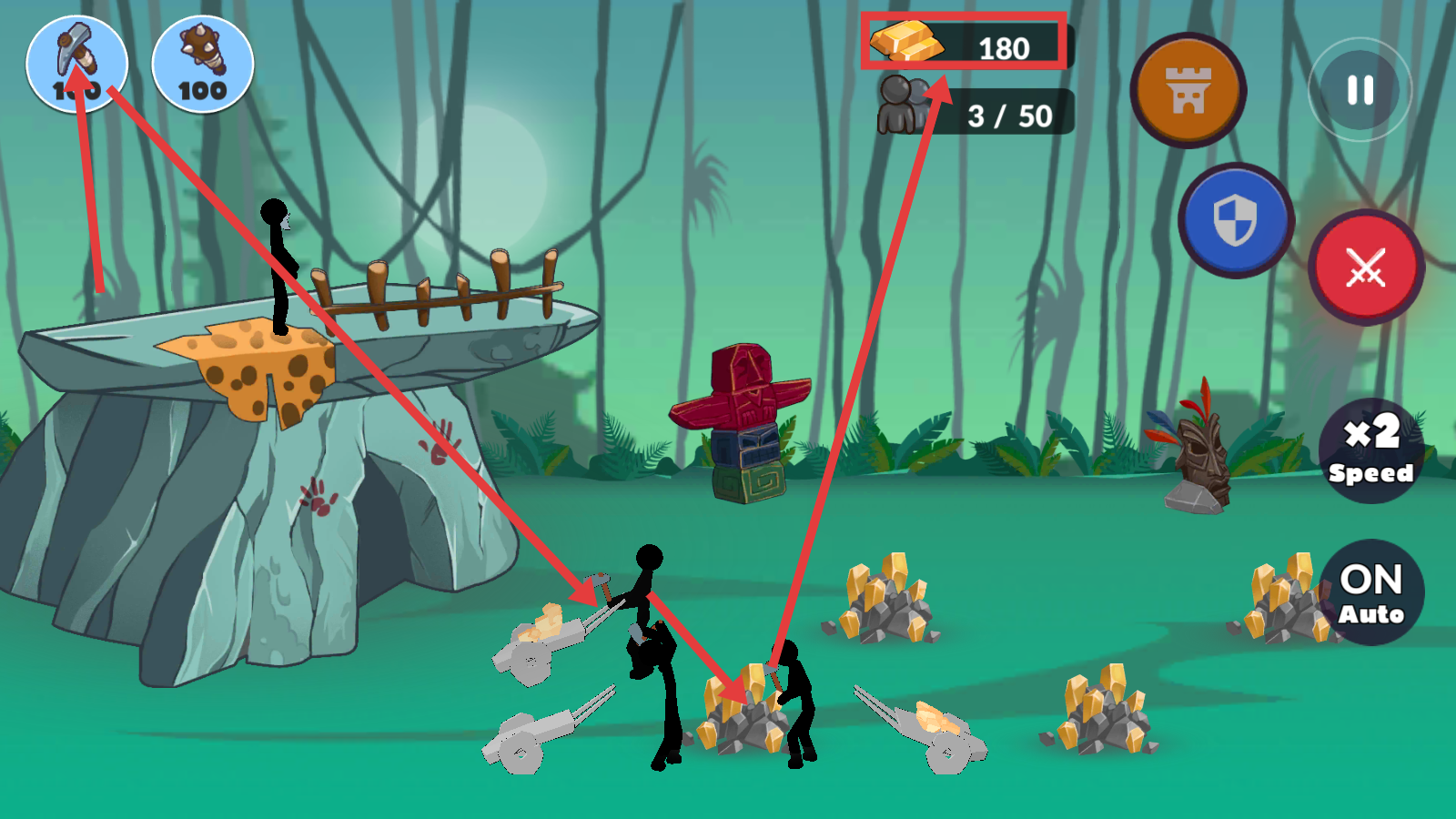 2、安排火柴人采集黄金,关注【黄金-180】等资源积累,为后续升级和战斗储备物资。