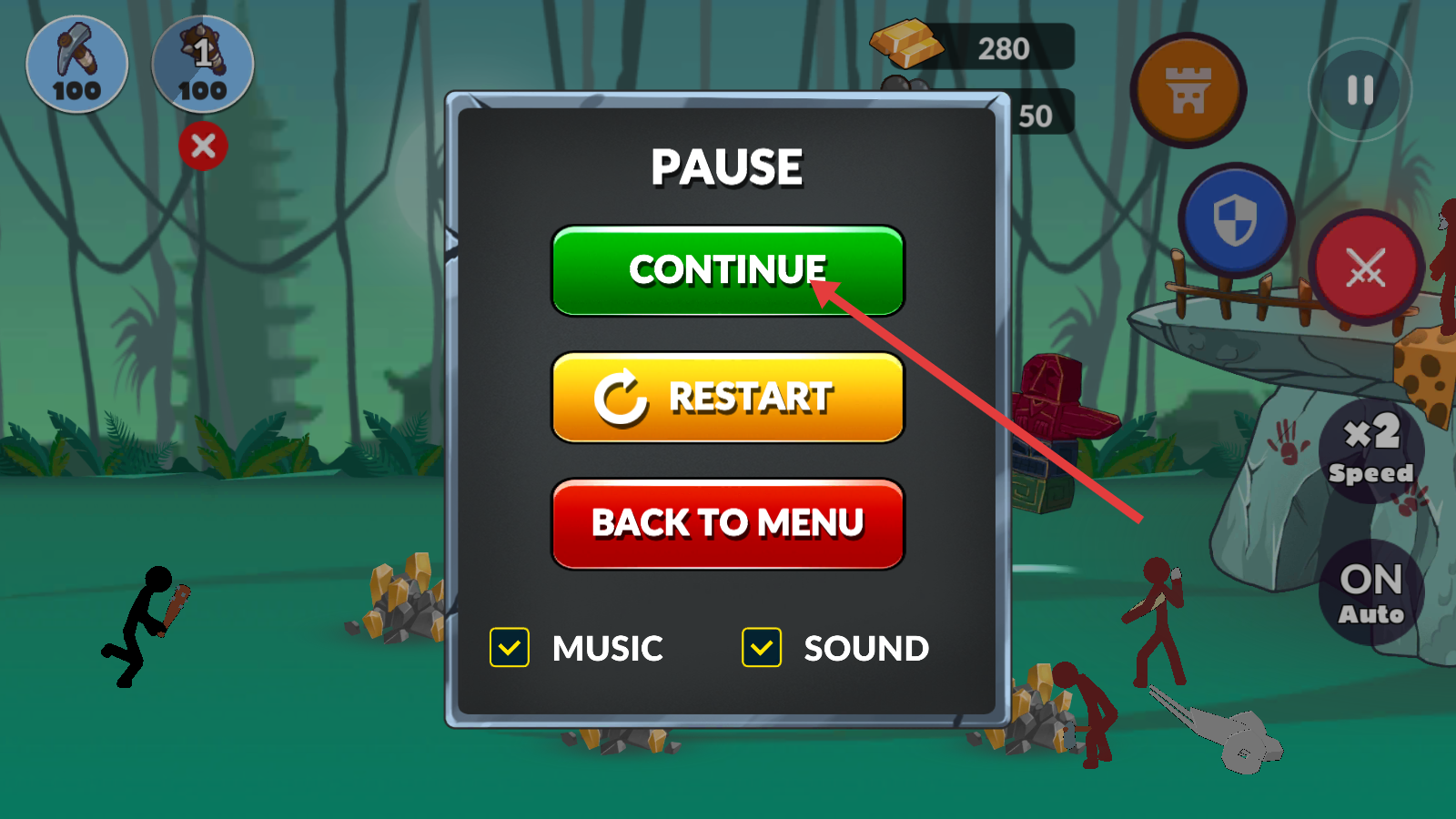 4、若暂停游戏,点击【CONTINUE】继续战斗,合理利用暂停功能调整策略,确保游戏进程顺畅。