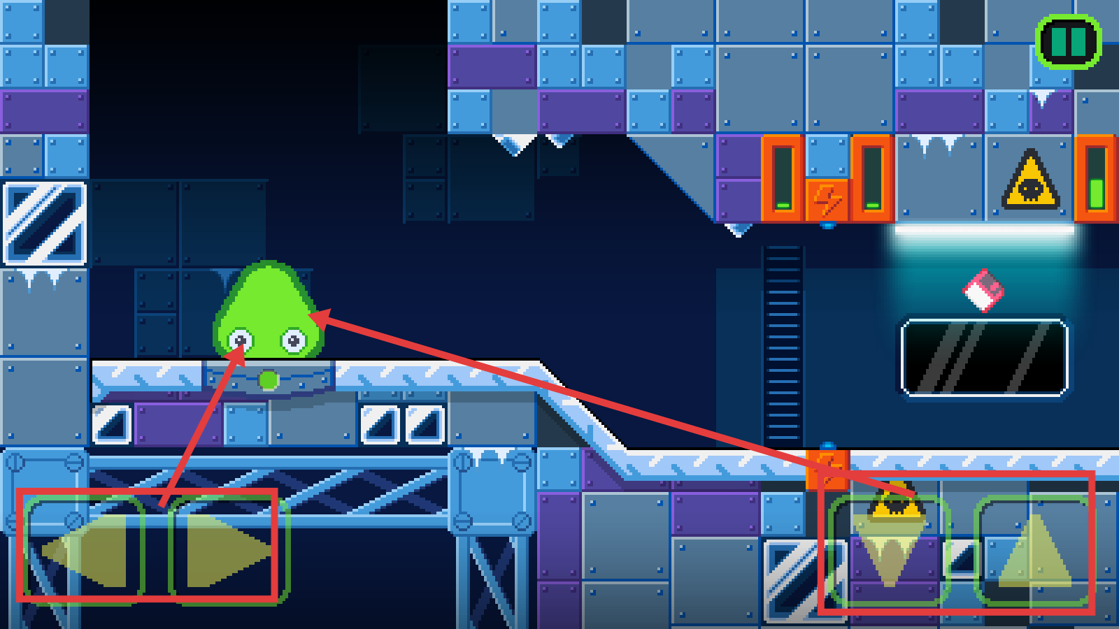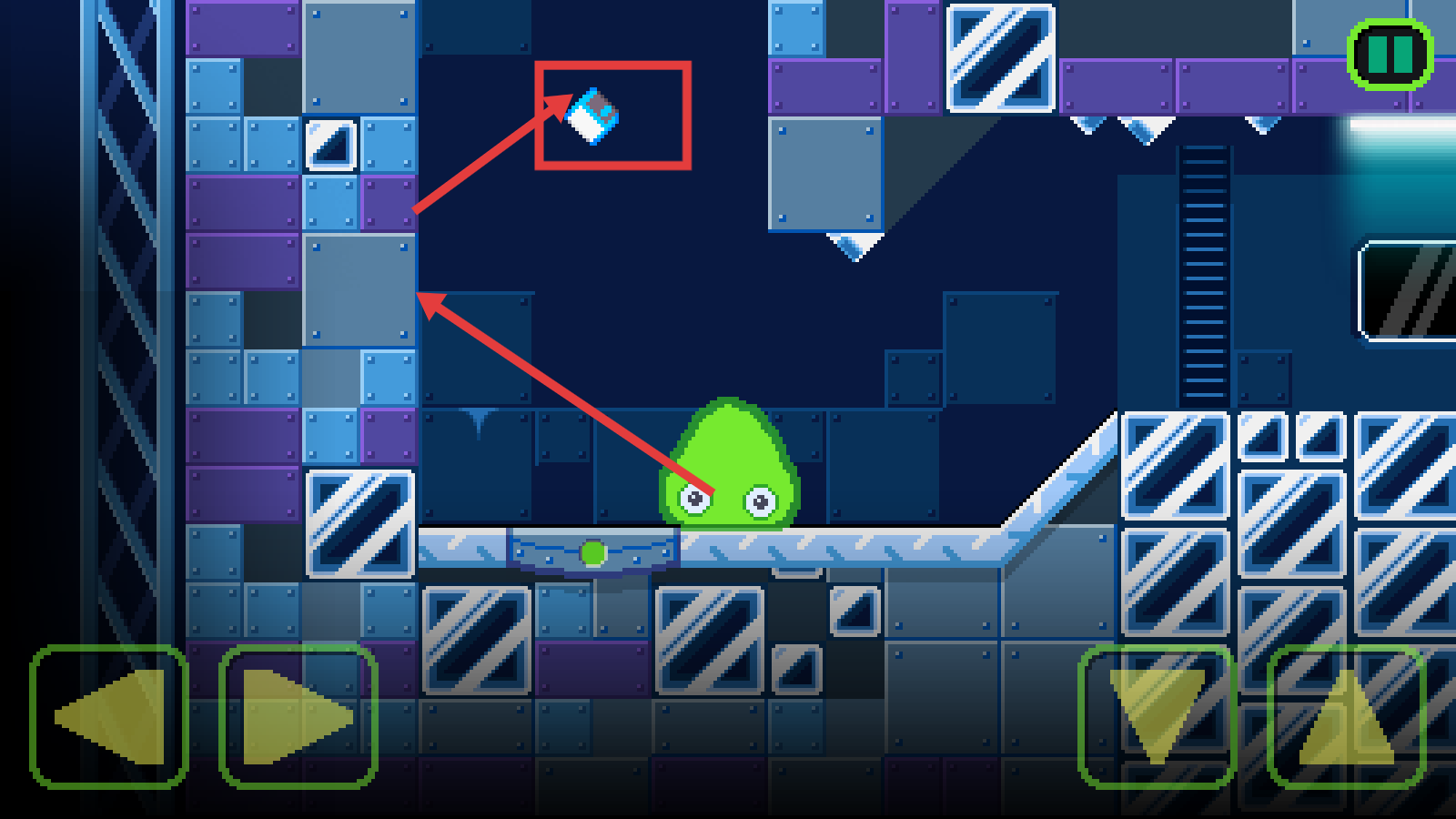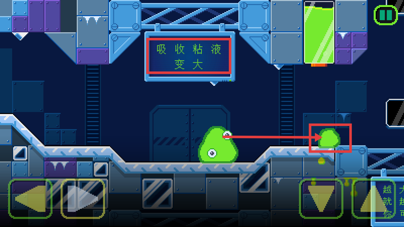 1、利用左右移动按钮控制绿色史莱姆移动,避开敌方区域,探索关卡路径,为后续收集道具做准备。