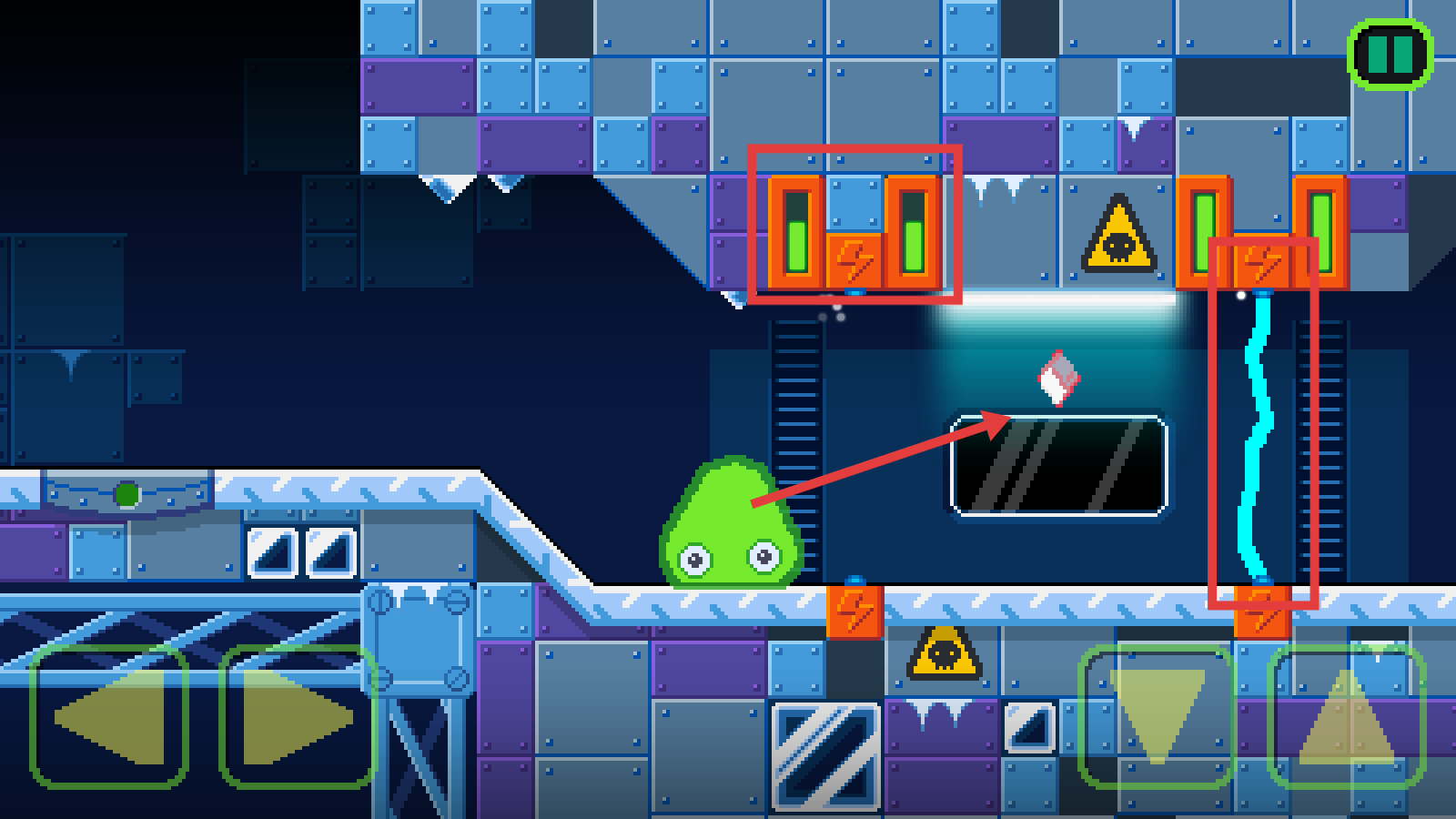 2、操控史莱姆靠近电力机关,获取途中道具,注意机关触发机制,稳步推进关卡进程。