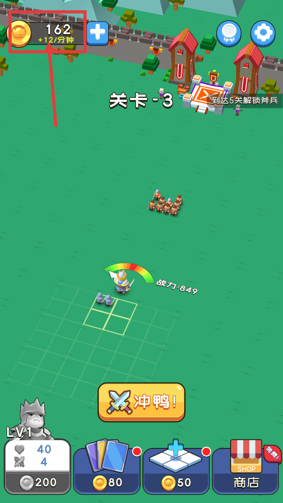 1、进入游戏后关注【金币-162-+12/分钟】,了解资源获取速率,为后续士兵解锁和升级积累基础资源。
