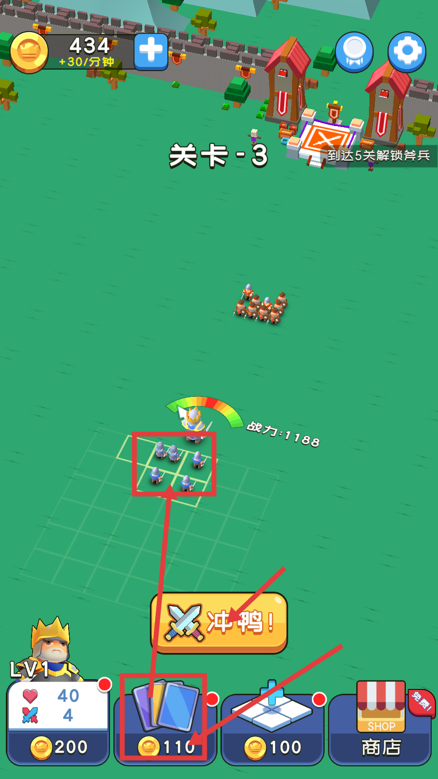 2、花费【金币-110】解锁士兵卡牌,布置士兵增强战力,点击【冲鸭】按钮发起进攻,开启战斗征程。