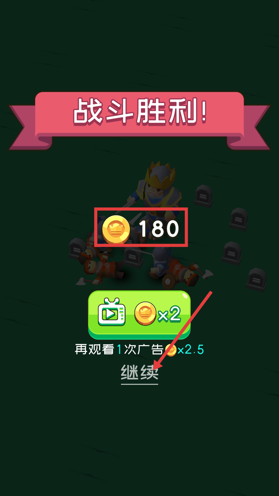 4、战斗胜利后领取【金币-180】奖励,点击继续按钮,积累资源用于后续士兵升级和新关卡挑战。