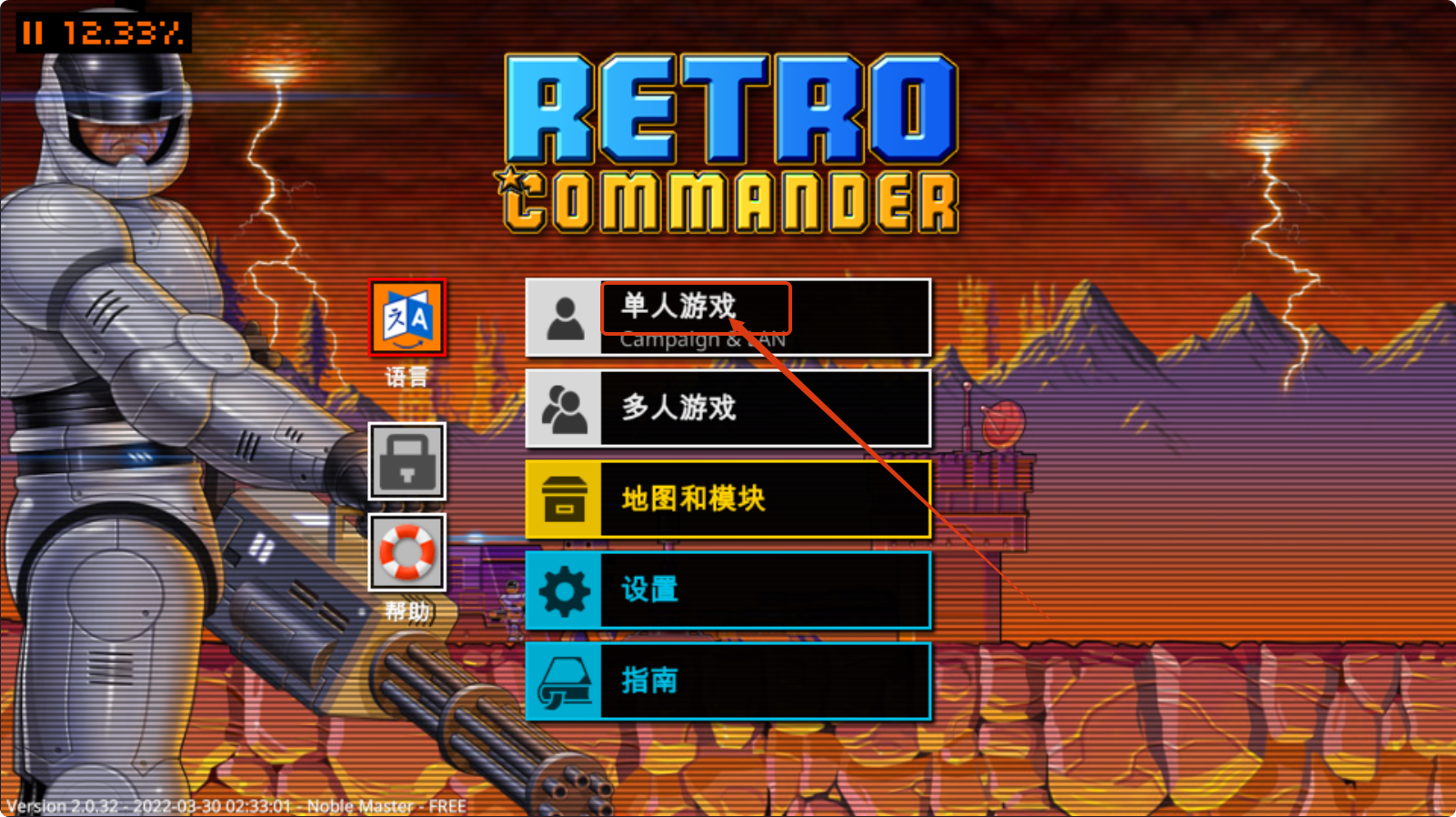 1、进入【Retro-Commander】后,点击【单人游戏】开始征程,先从单人模式熟悉游戏机制更稳妥。