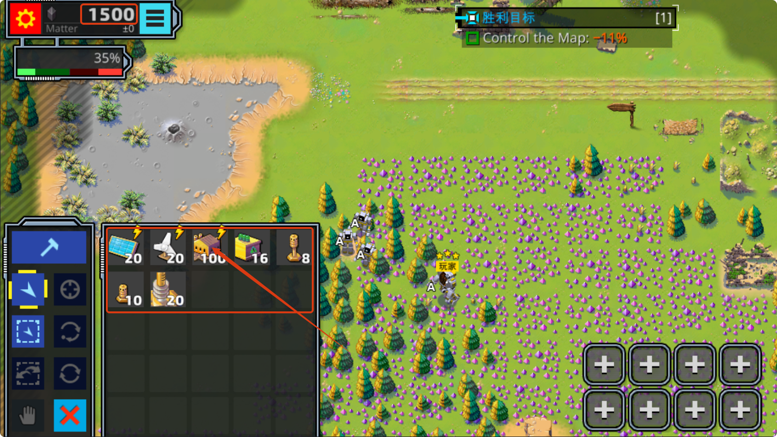 3、选定建筑后,在地图合适位置点击放置,如示例中建造的建筑,逐步构建基地建筑布局,扩大控制区域。