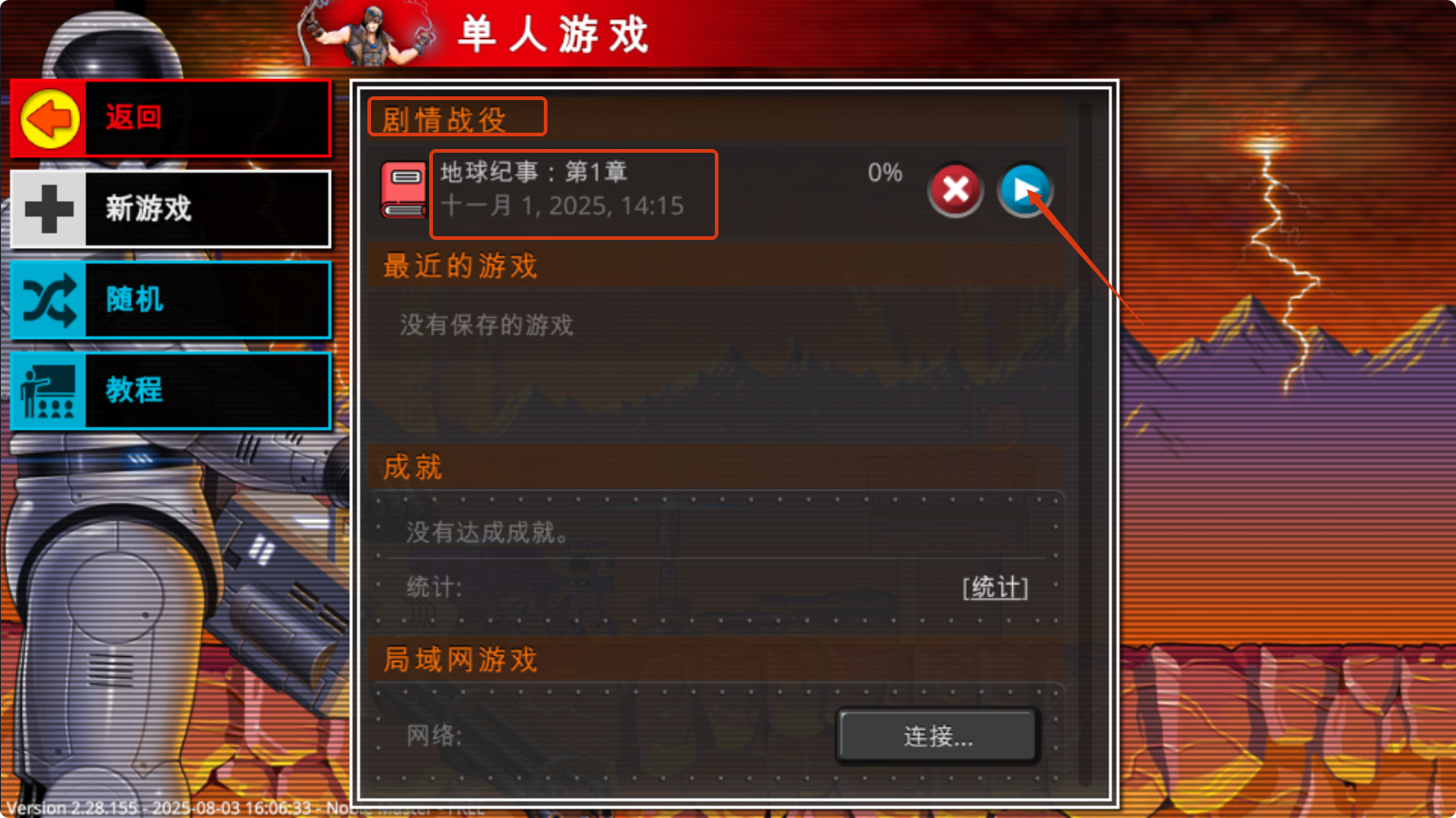 1、进入单人游戏后,选择【地球纪事:第1章】剧情战役,点击开始按钮开启第一章的冒险征程。