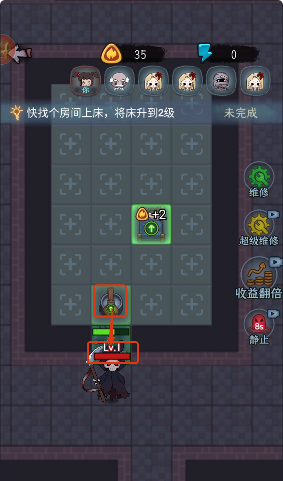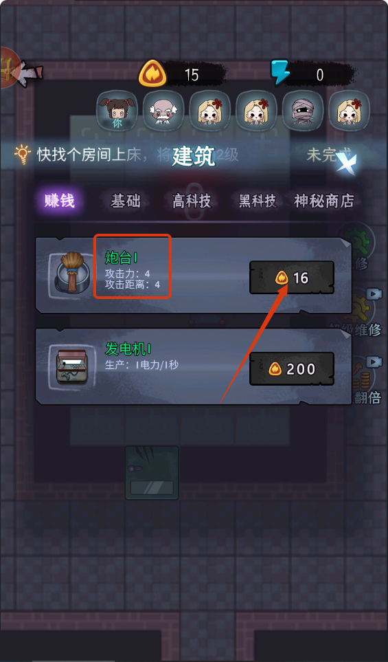 2、进入战局后,快找房间上床,通过床持续获取【火焰-15】资源,为后续建筑升级奠基。
