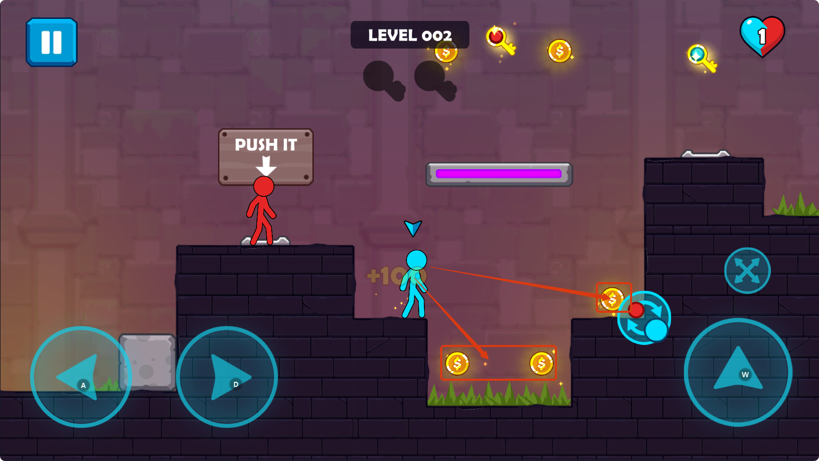 2、在LEVEL-002中,利用【方向键-A/D】和【切换角色按钮】,操控红蓝小人协作,推动石块等机关推进关卡。