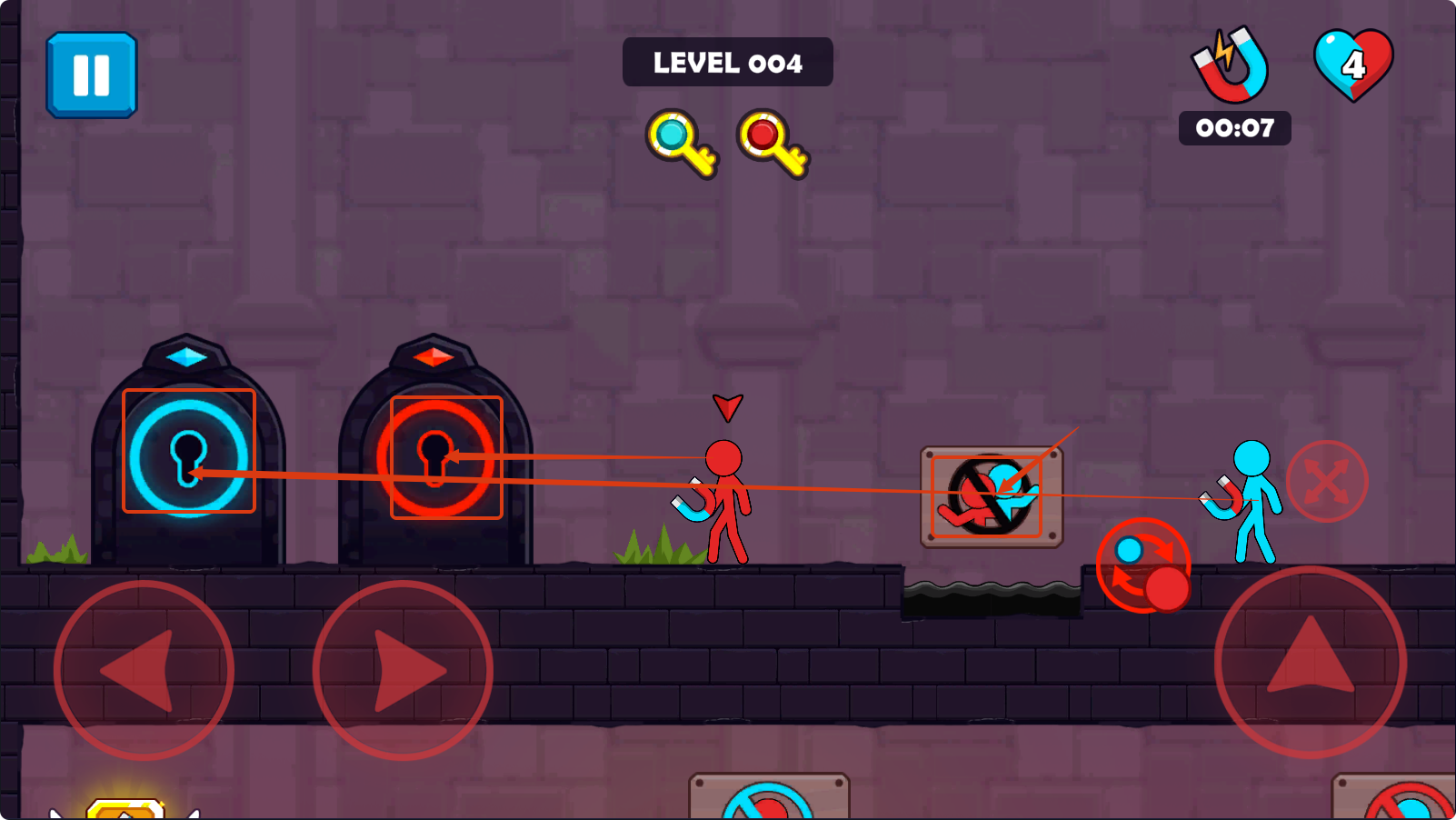 3、遇到红蓝门时,让对应颜色小人携带钥匙开门,注意避开禁止区域,协作通关。