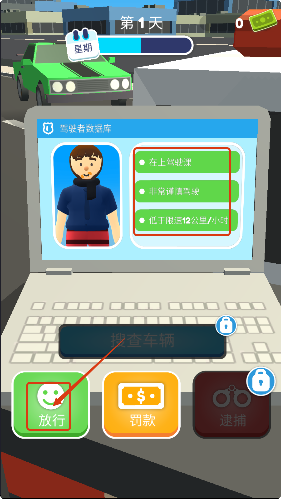 4、查看驾驶者数据库,若符合【在上驾驶课】等良好驾驶情况,点击【放行】,高效处理合规车辆。