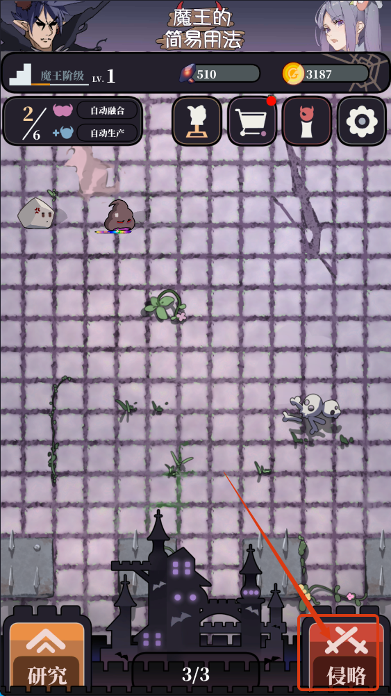 1、在魔王城界面,点击【侵略】按钮,进入侵略关卡,开启资源获取的侵略之旅。