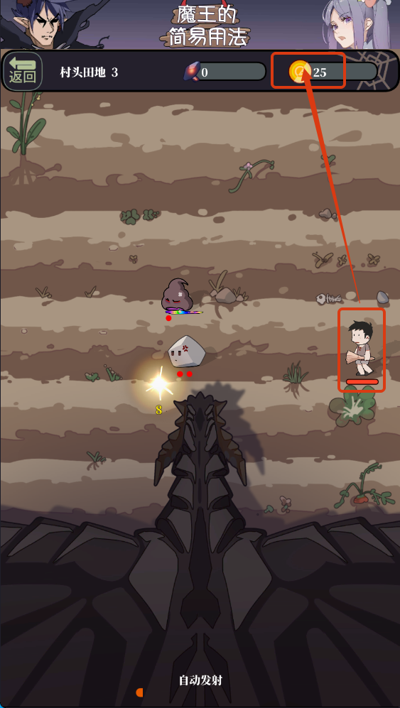 3、在【村头田地-3】,消灭村民后获取【金币-25】,积累资源以提升自身战力。