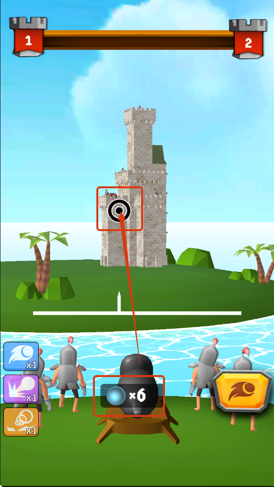 2、战斗中瞄准敌方城堡的目标点,利用【×6-炮弹】进行攻击,精准打击摧毁建筑。
