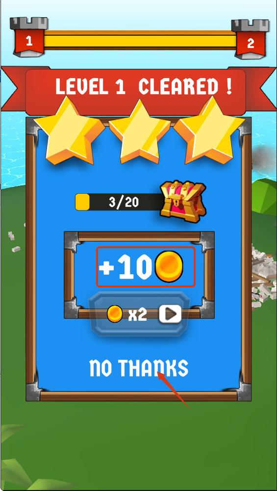 4、通关后领取【+10-金币】奖励,可选择【no-THANKS】继续下一关,积累资源提升战力。
