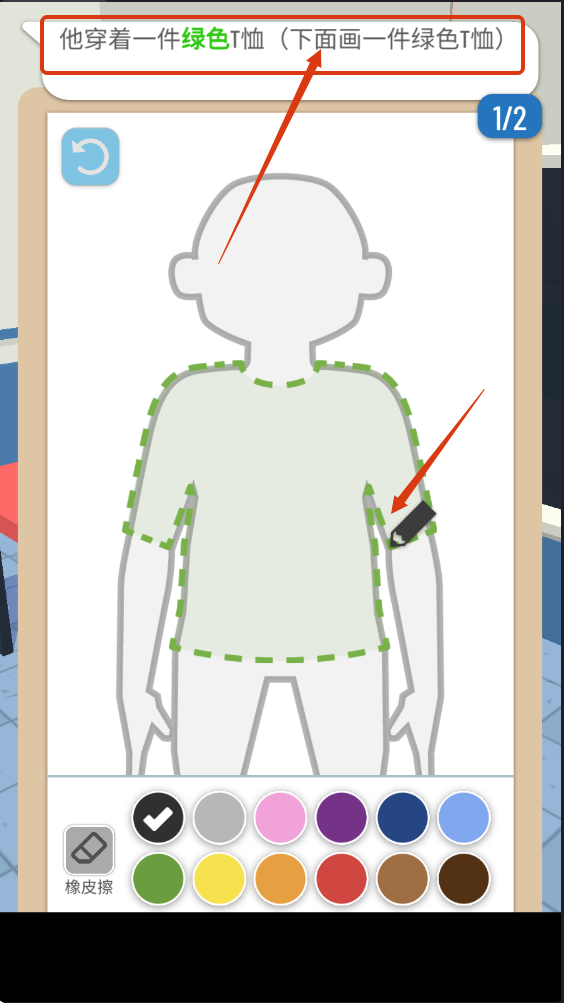 1、根据提示【他穿着一件绿色T恤(下面画一件绿色T恤)】,选择绿色颜料填充T恤区域,完成第一步画像。