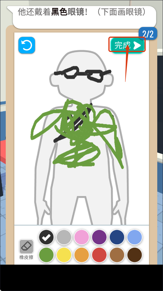 2、按照【他还戴着黑色眼镜!(下面画眼镜)】提示画好眼镜,点击【完成】按钮,完成画像任务。