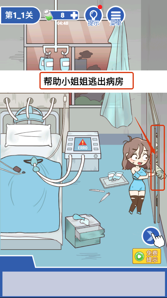 2、在第1-1关,聚焦【帮助小姐姐逃出病房】,检查右侧柜子等区域,寻找逃离关键道具或线索。